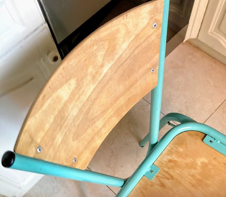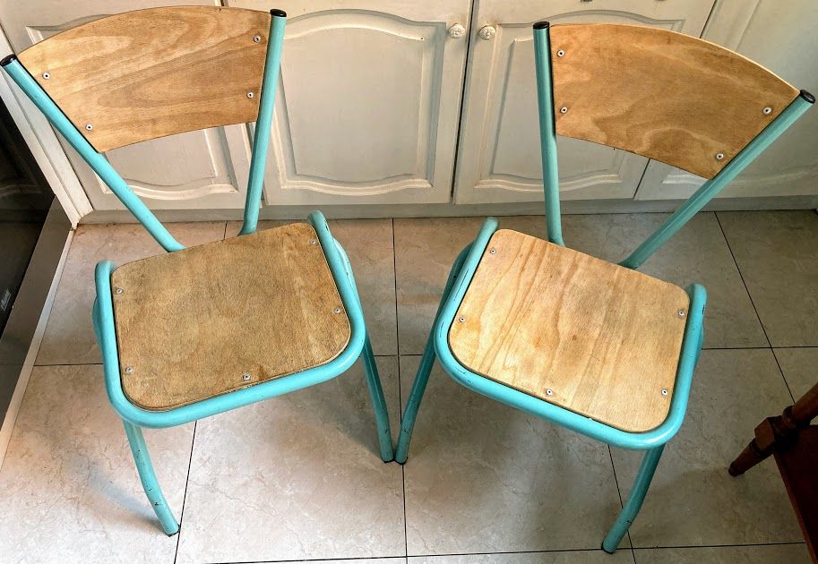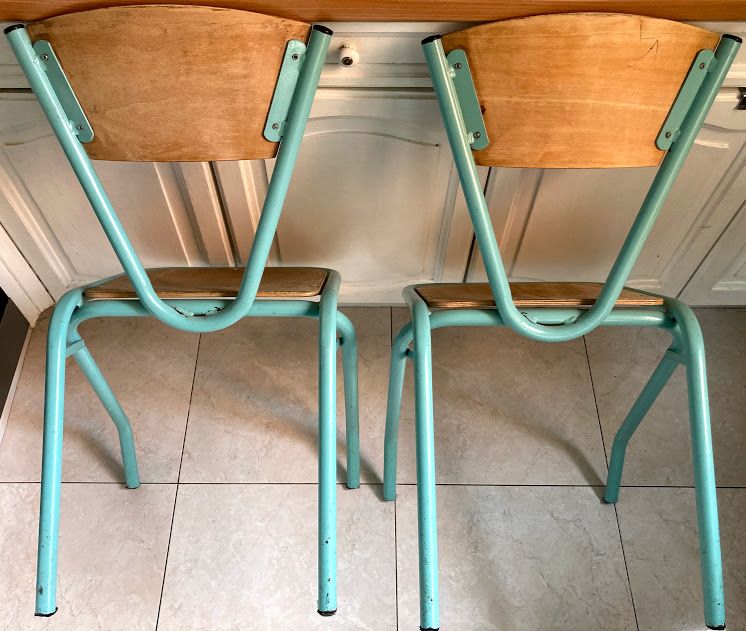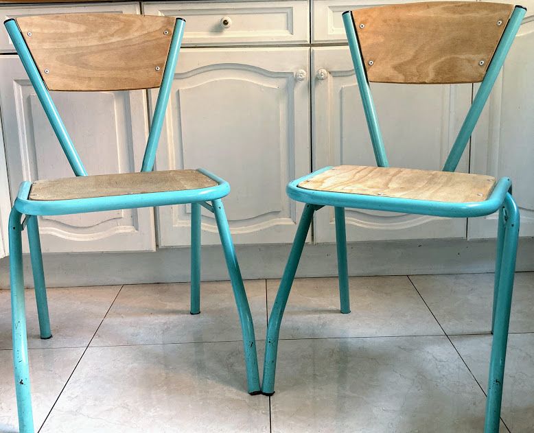 Paire de chaises d'école Vintage avec cadre en métal vert d’eau.