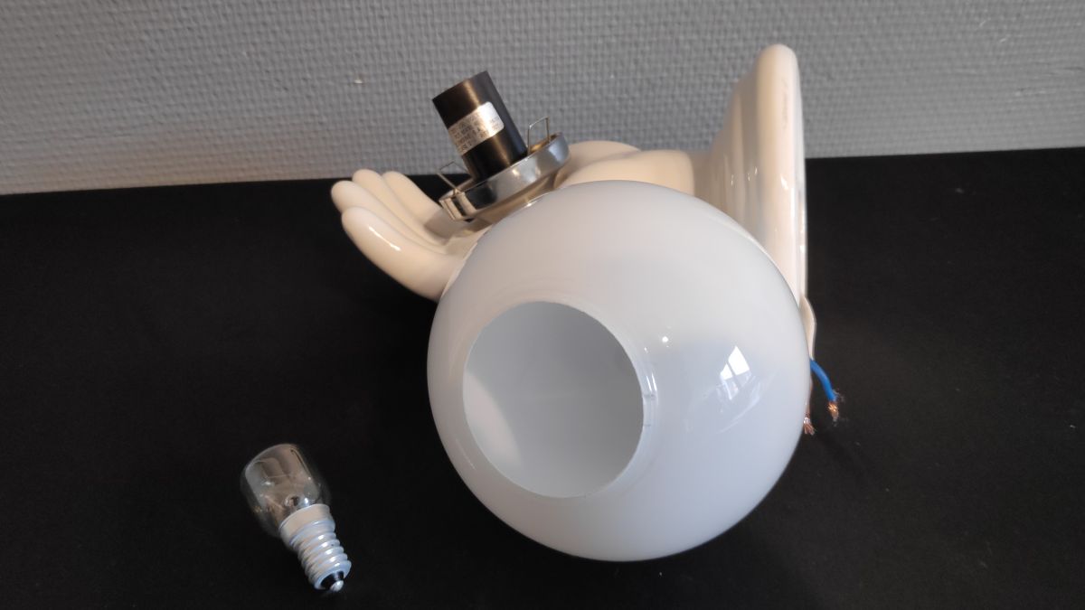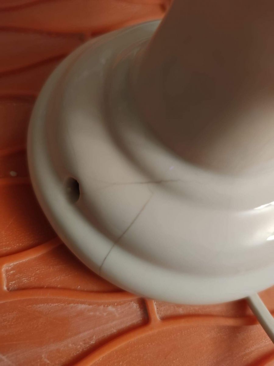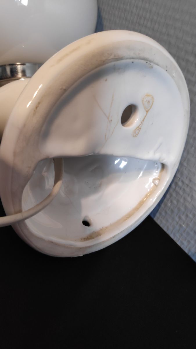 Il s'agit au départ d'une applique murale, donc il n'y a pas de prise ni d'interrupteur, mais il est tout à fait possible de la modifier si vous voulez que nous le faissions, et de rajouter un fil avec une interrupteur et une prise. Vous avez vu qu'elle est fêlée sur le dessus et en dessous sur les photos. Malheureusement, nous ne pouvons pas mettre plus de 5 photos sur les annonces pour tout montrer.