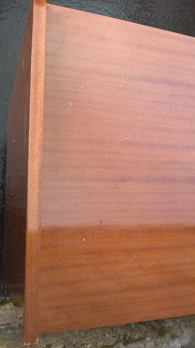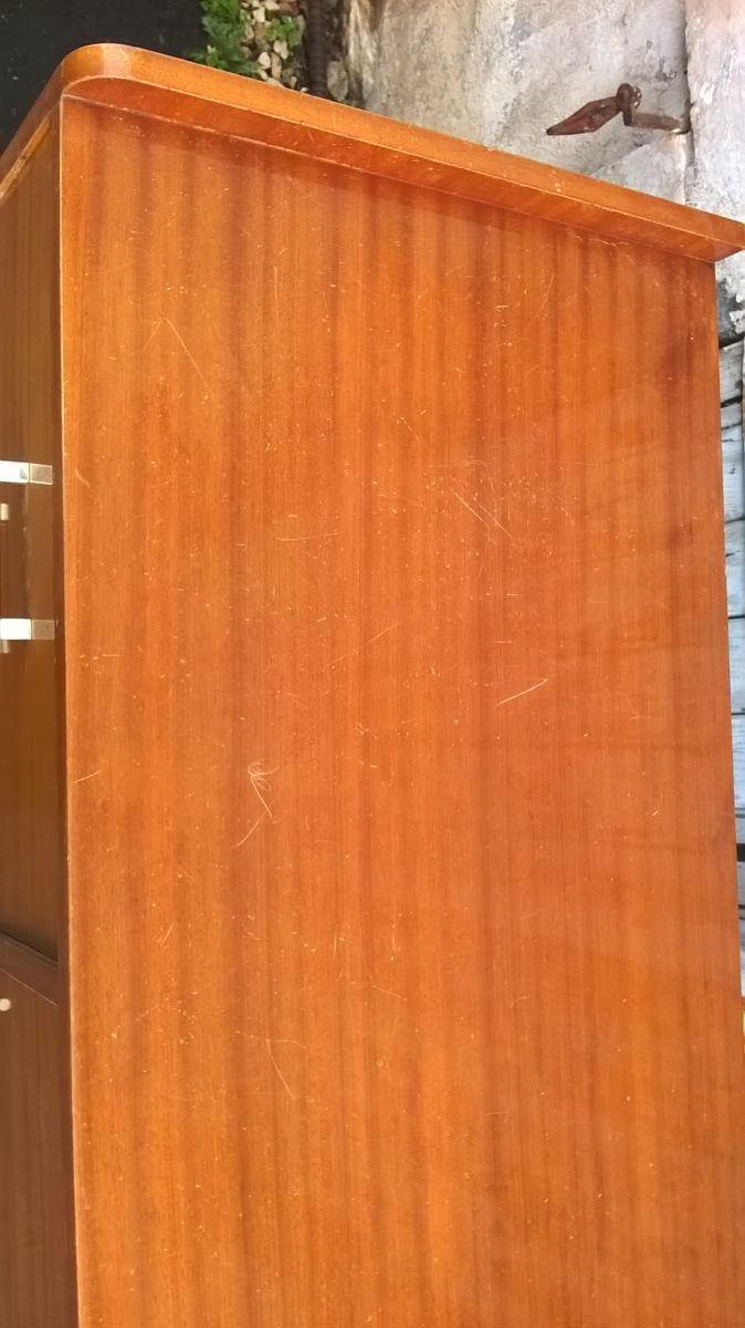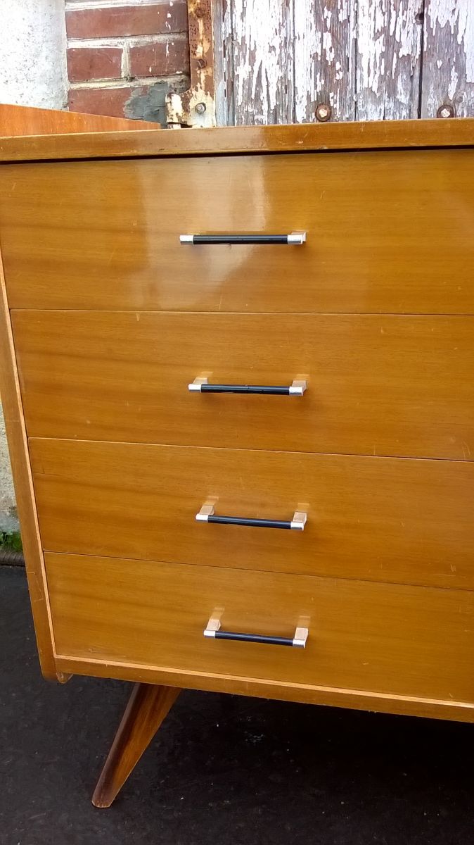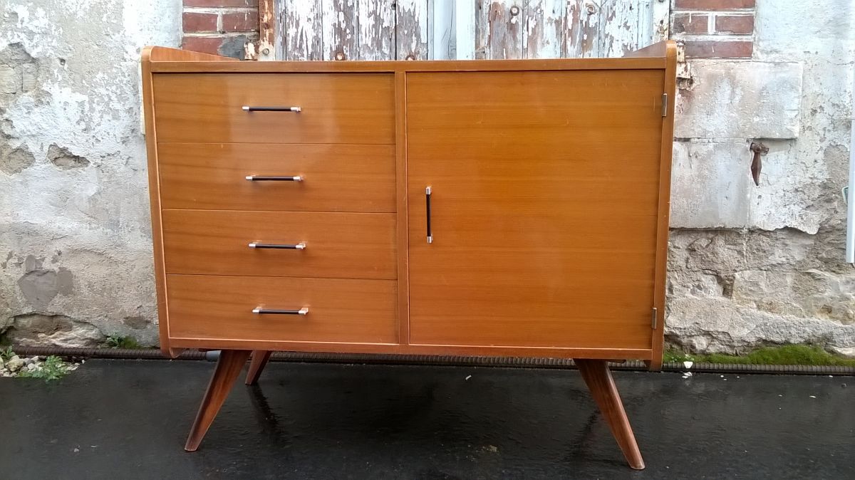 Petite enfilade année 60. Pied compas. Elle est en bois vernis. A noté quelque rayure du vernis et quelque léger manque de plaquage. hauteur 85 cm, largeur 100 cm, profondeur 50 cm. Quatre tiroir et une porte coté droit avec une étagère.