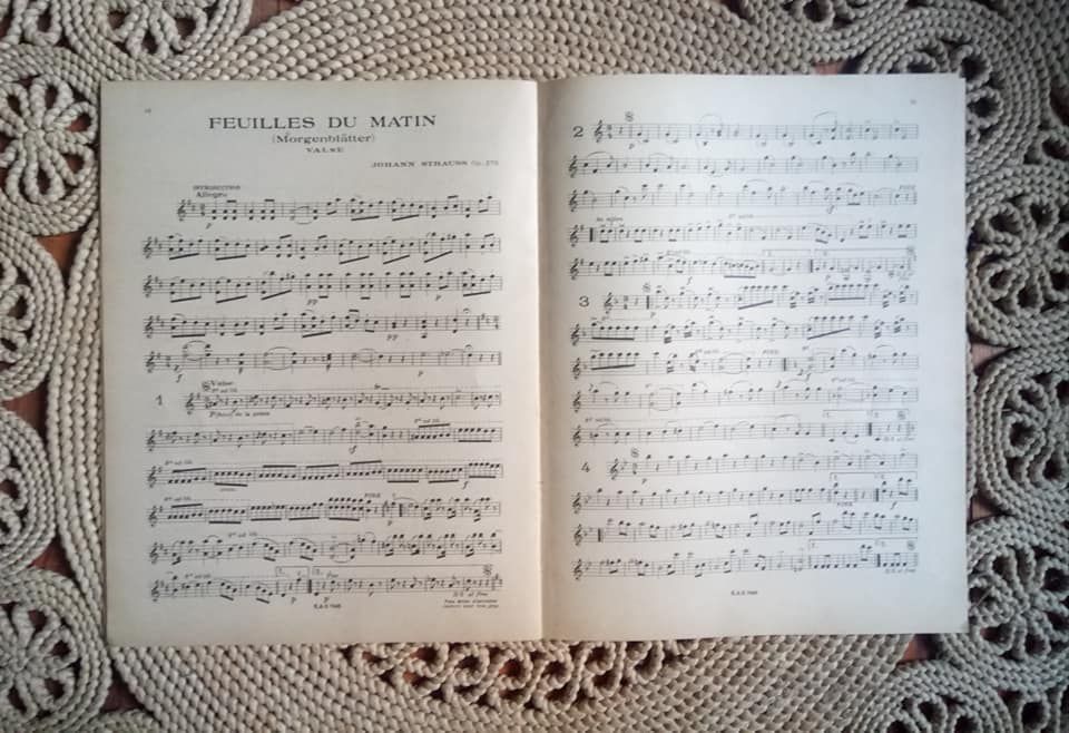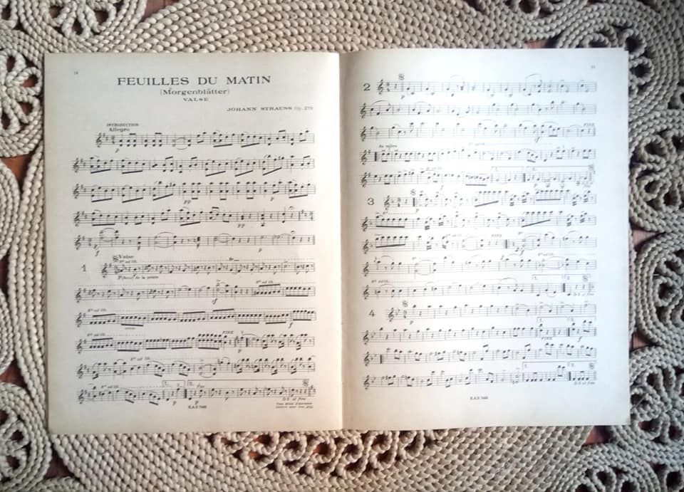 Parmi les partitions de valses se trouvent : le beau Danube bleu, bonbons de Vienne, rêve de printemps, les baisers, la vie d'artiste ...