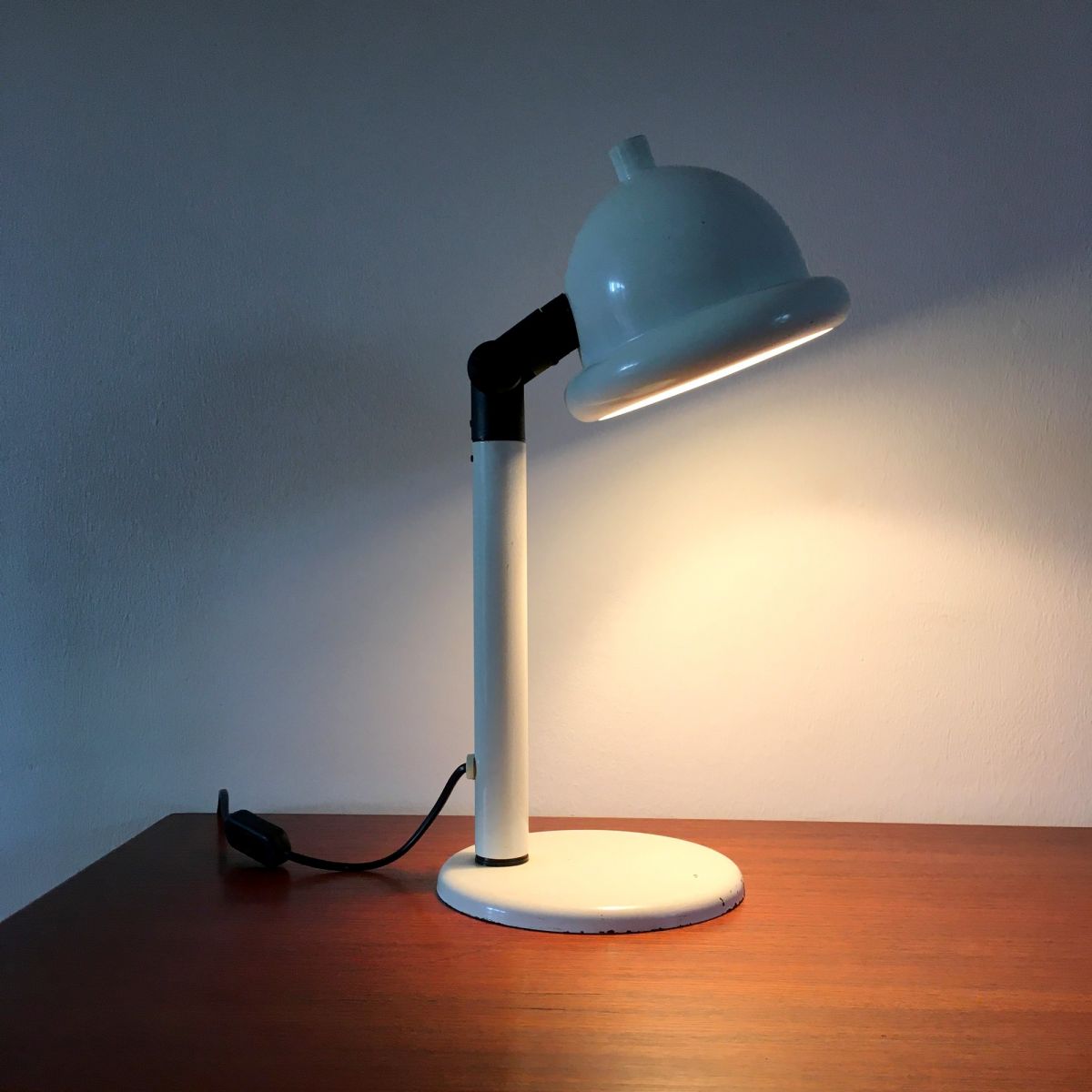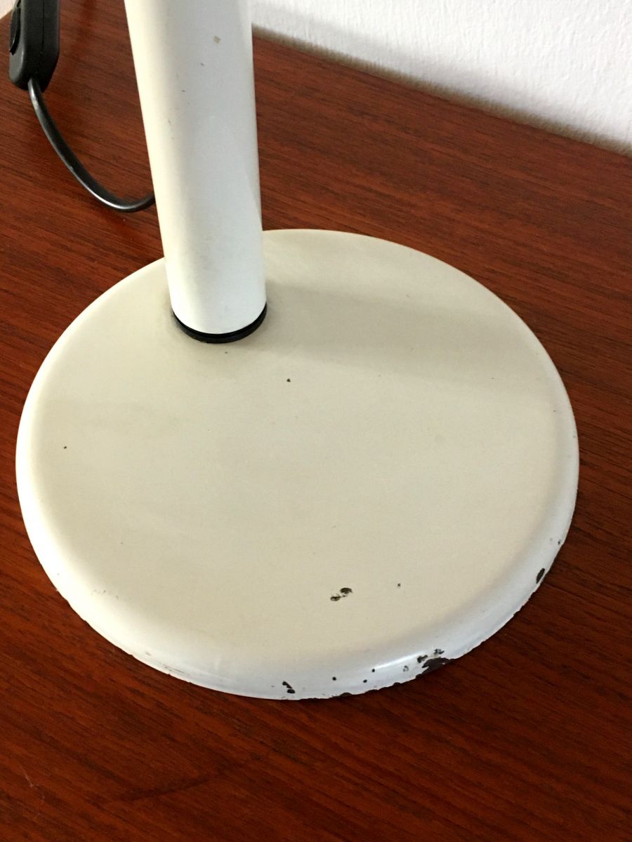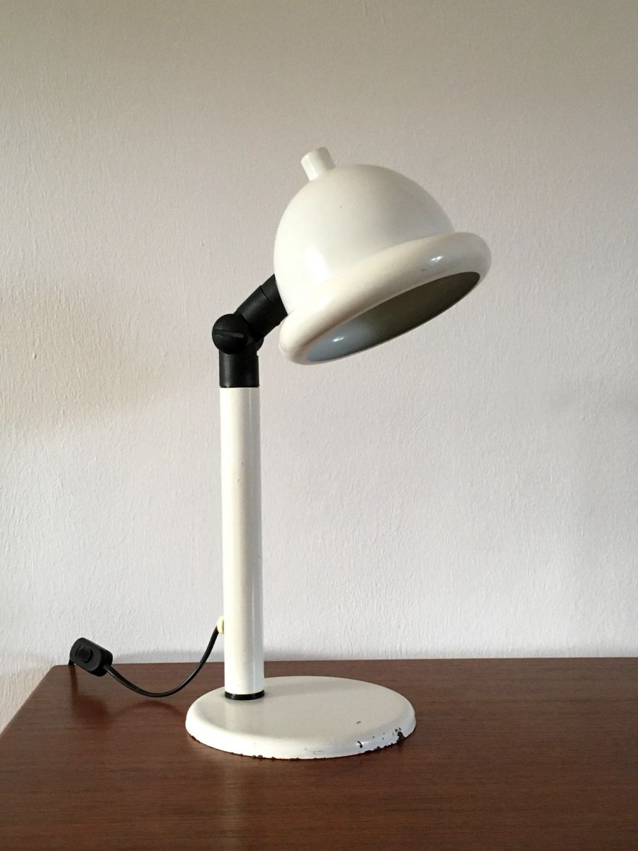 Lampe en métal des années 80 en bon état. Diffuseur pivotant, douille à vis E14, électrification testée, traces d’usage visible sur les photos.
