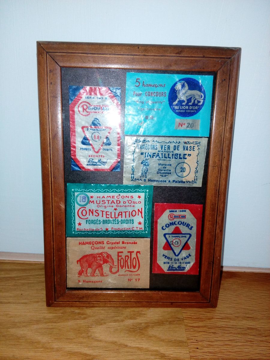 Charmant petit cadre ancien qui présente des petits sachets anciens très décorés et colorés d'hameçons, avec des noms qui feront certainement rêver les amateurs de pêche : Redoutable, Infaillible, Au Lion d'Or... Idéal pour faire plaisir au pécheur de la maison sans gâcher sa déco ;)