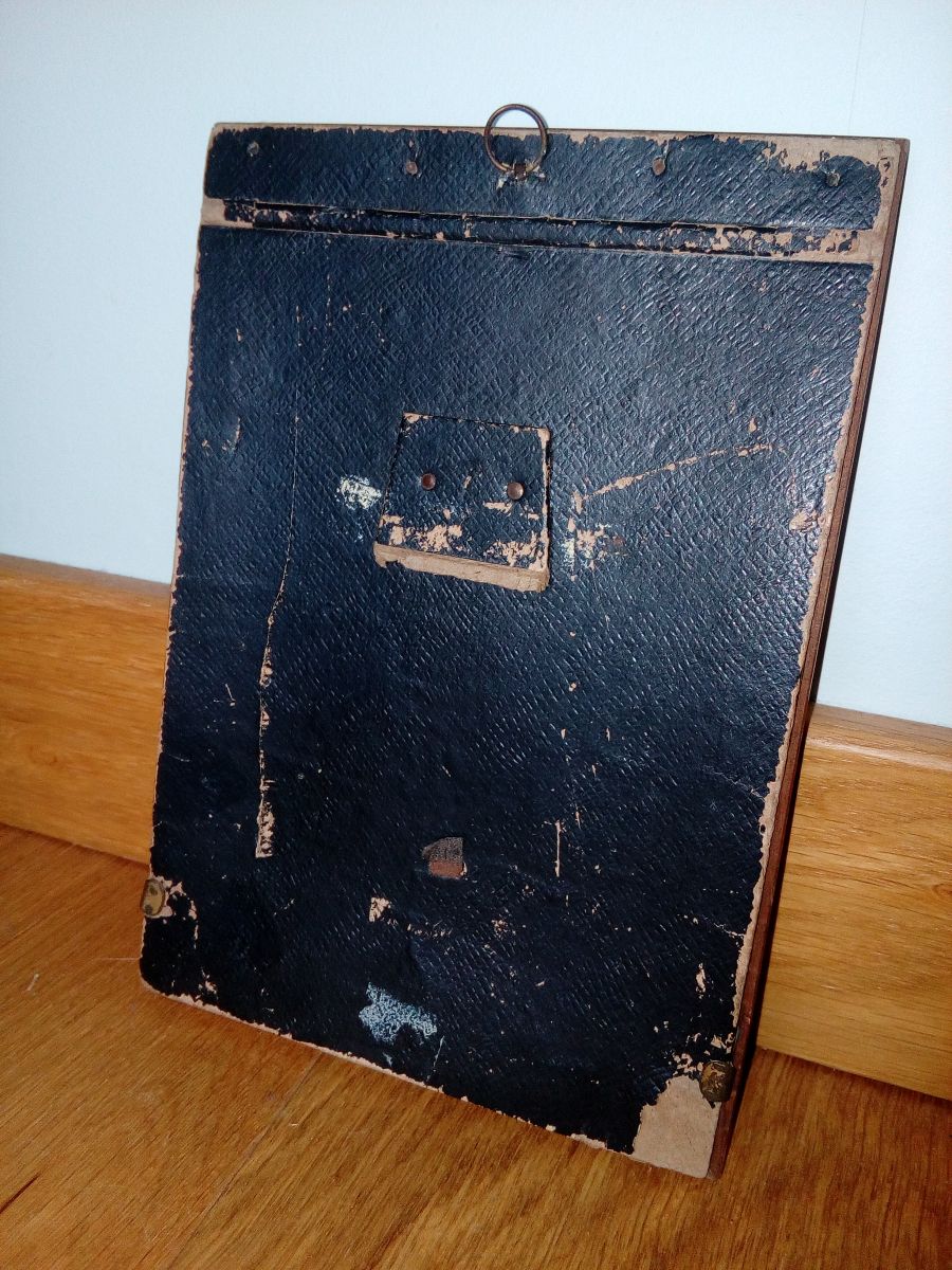 Le cadre en bois est en bon état. La plaque arrière comportant un anneau de suspension est en mauvais état : il devait y avoir une « patte » pour que le cadre puisse être posé sur un meuble, mais elle n'est plus présente. Les deux parties sont maintenues ensemble par deux petits fermoirs pivotant.
