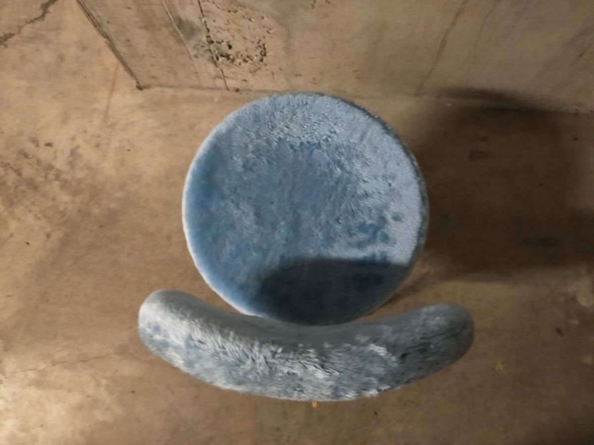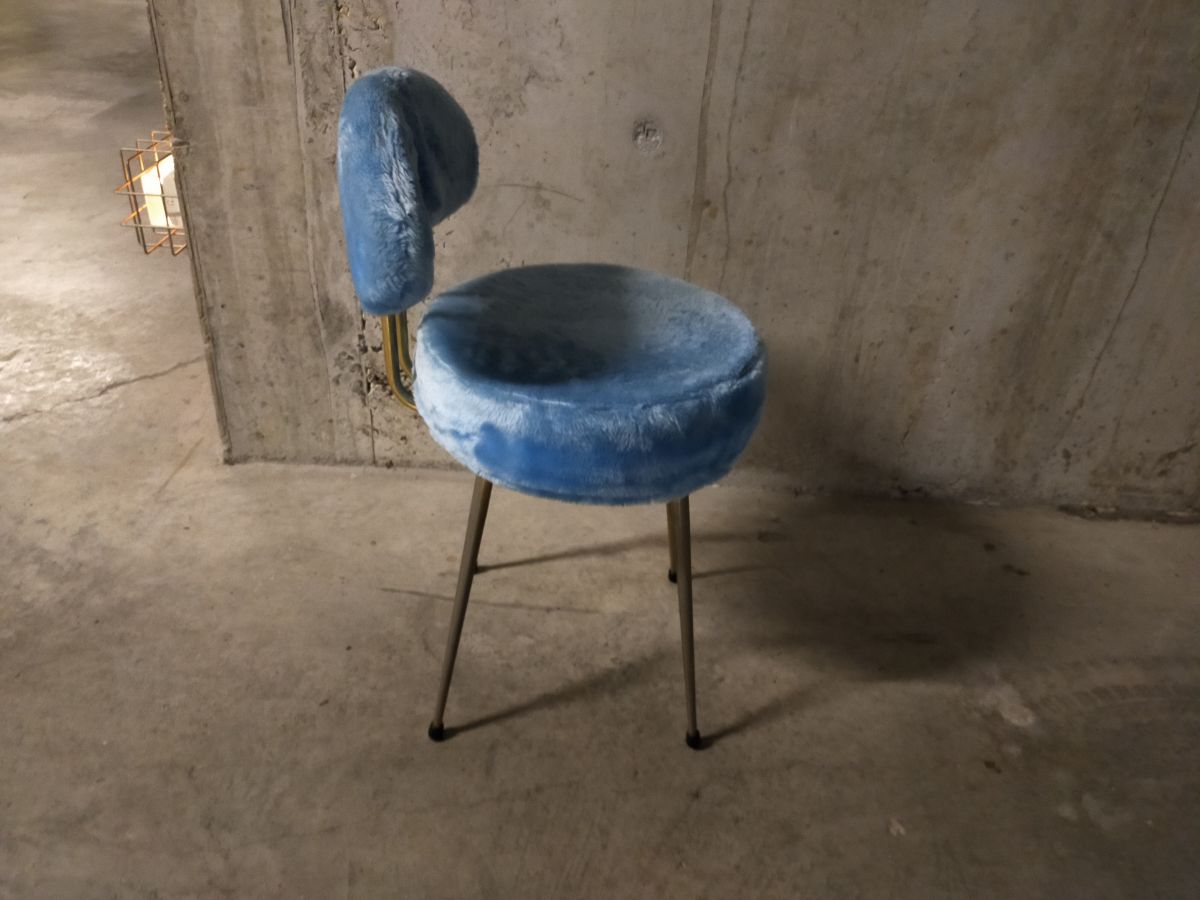 Petite chaise en moumoute bleu clair des années 70 de style Pelfran, hauteur totale 75cm, diamètre assise 40cm, hauteur assise 50cm, bon état.