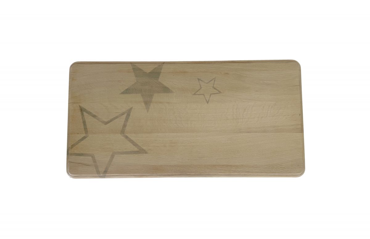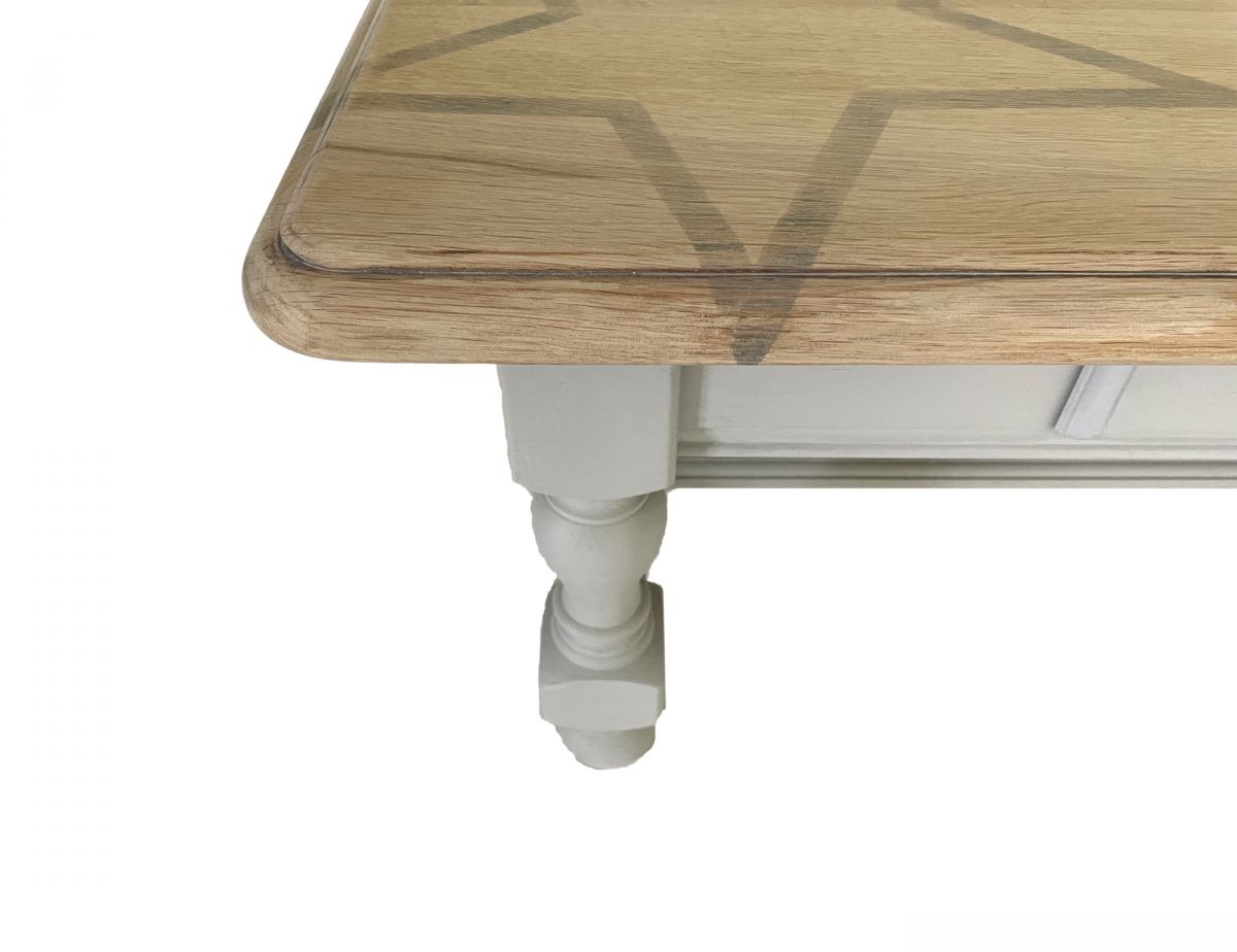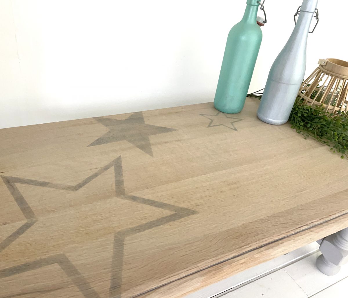 Sur le dessus, il a été poncé pour enlever l'ancien vernis foncé et révéler le grain. Un lavis de couleur blanche a été ajouté pour donner un effet chaulé et quelques petits motifs étoiles pâles pour finir.