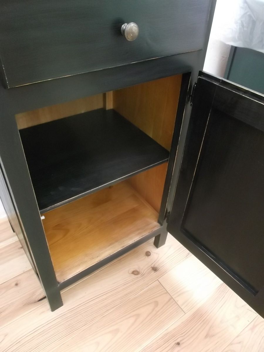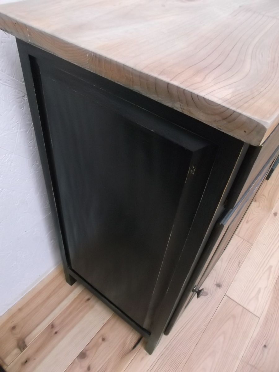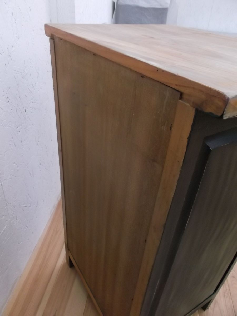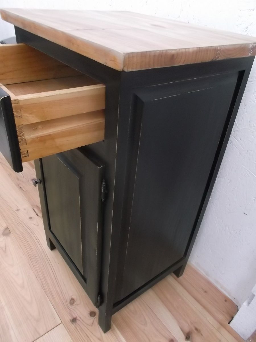 Confiturier, meuble de rangement, en pin massif, de couleur noir, usé et vieilli, patiné, 1 porte, 1 tiroir qui coulisse parfaitement. Plateau brut verni. Il s' intégrera dans toutes les piéces de votre intérieur, avec son style chic.