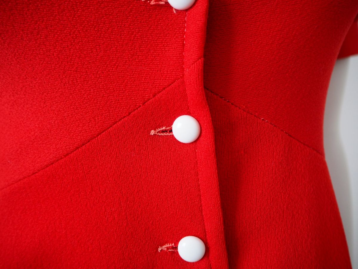 Pas d'étiquette, la robe est composée de polyester, une matière assez épaisse et légèrement élastique. Typique de la décennie. Pas de doublure.