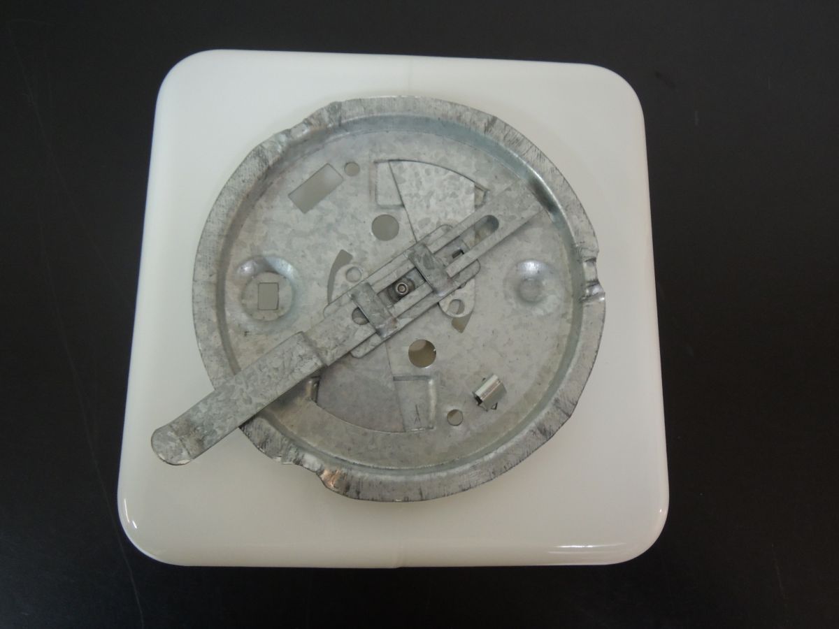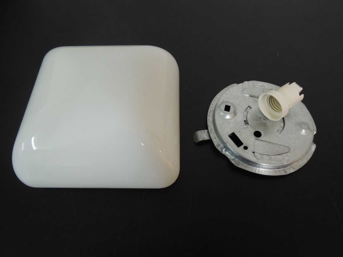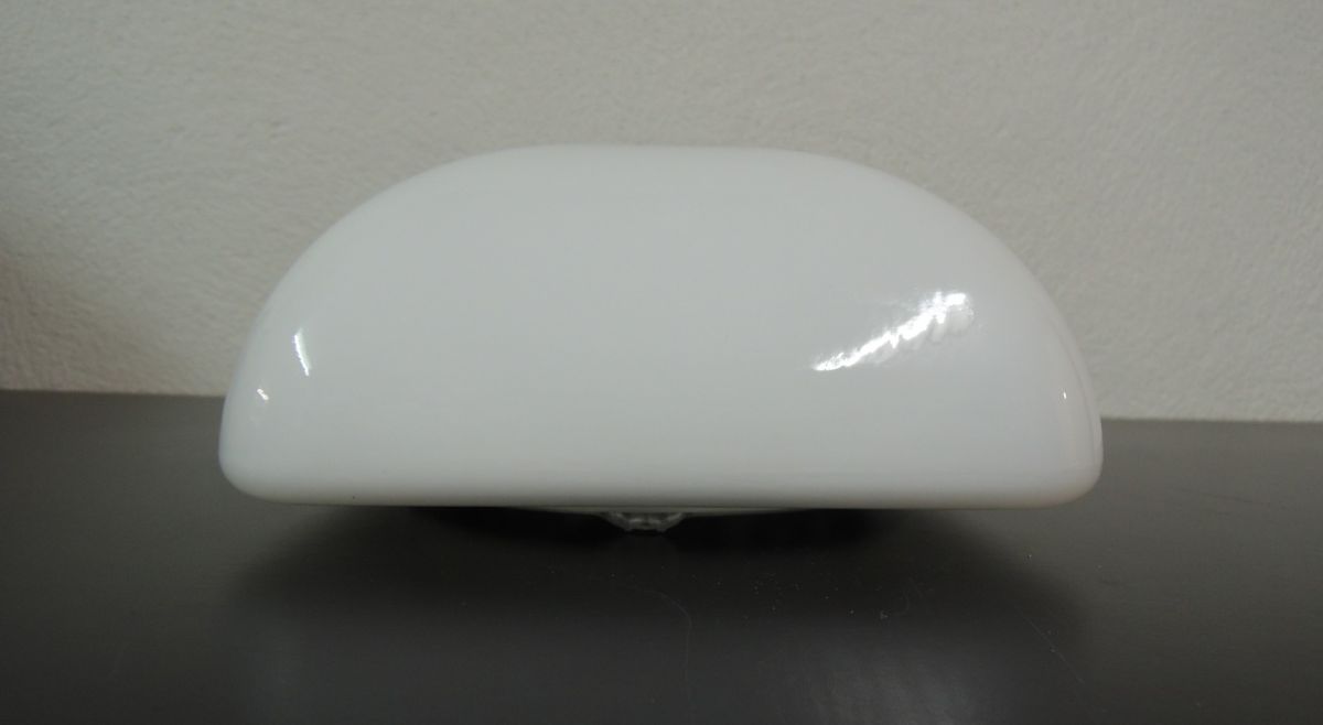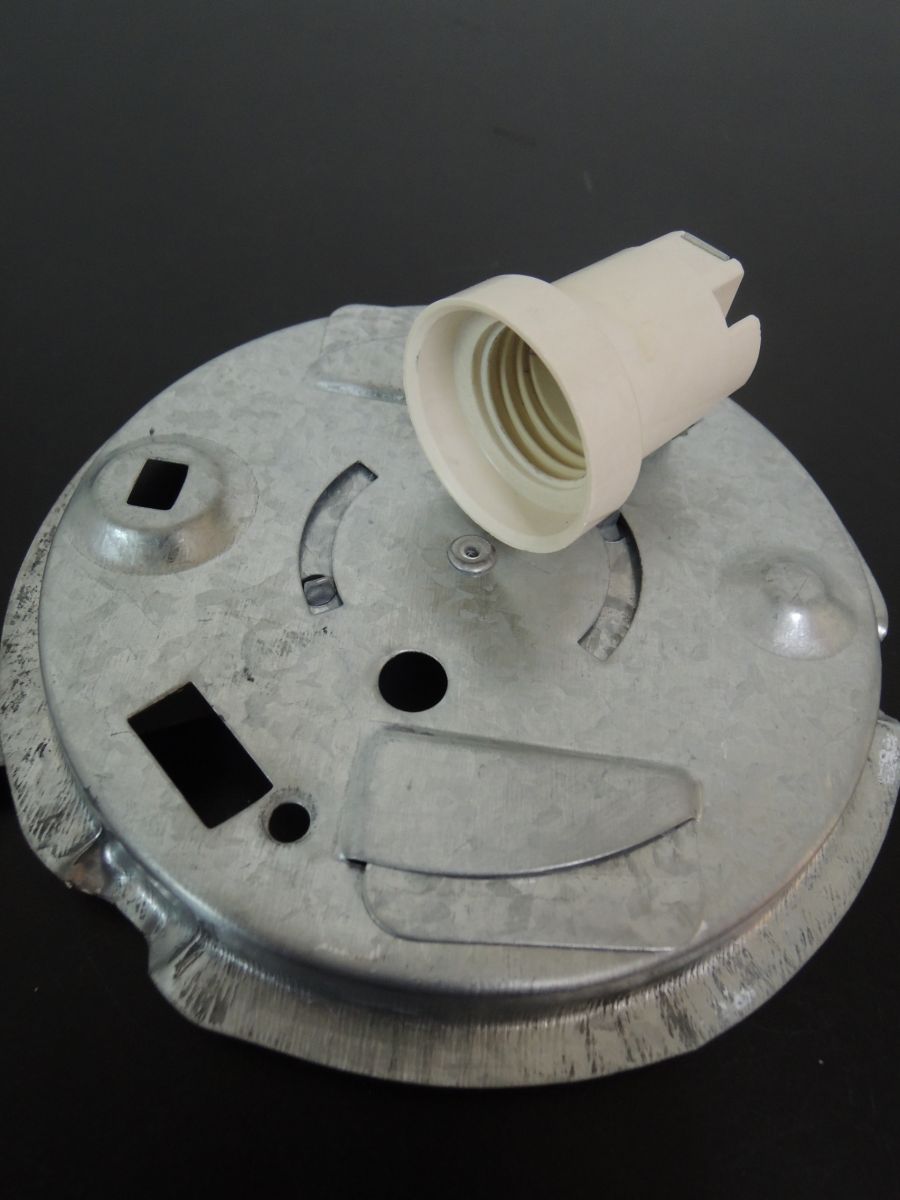 Plafonnier avec globe en opaline maintenu sur support en acier galvanisé par système " à tirette". Équipé d'une douille à vis en bakélite (type E27). Petites traces de peinture sur le socle (non visible après installation). Vendu non câblé
