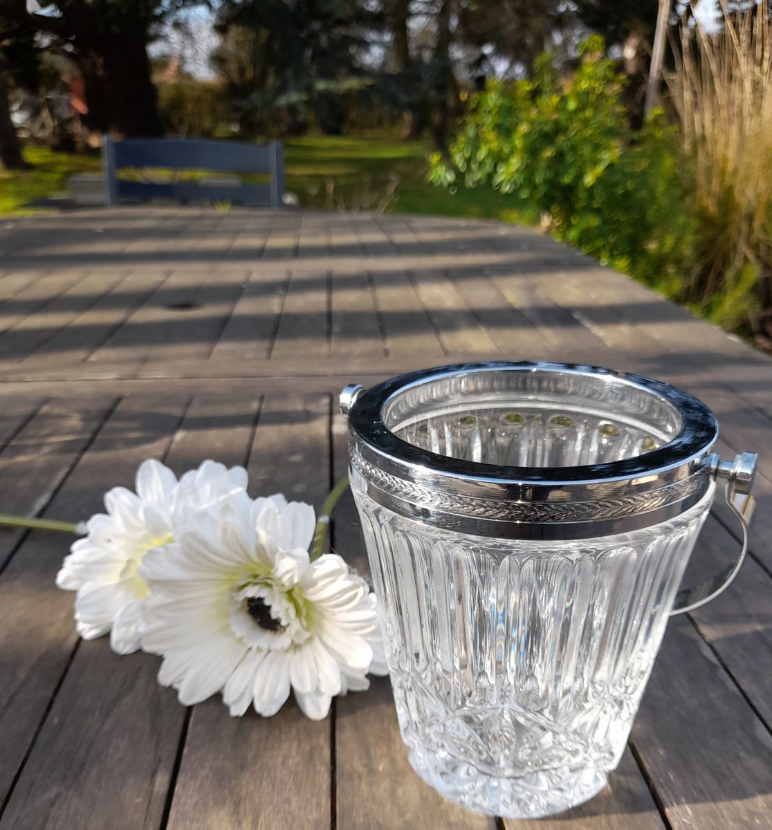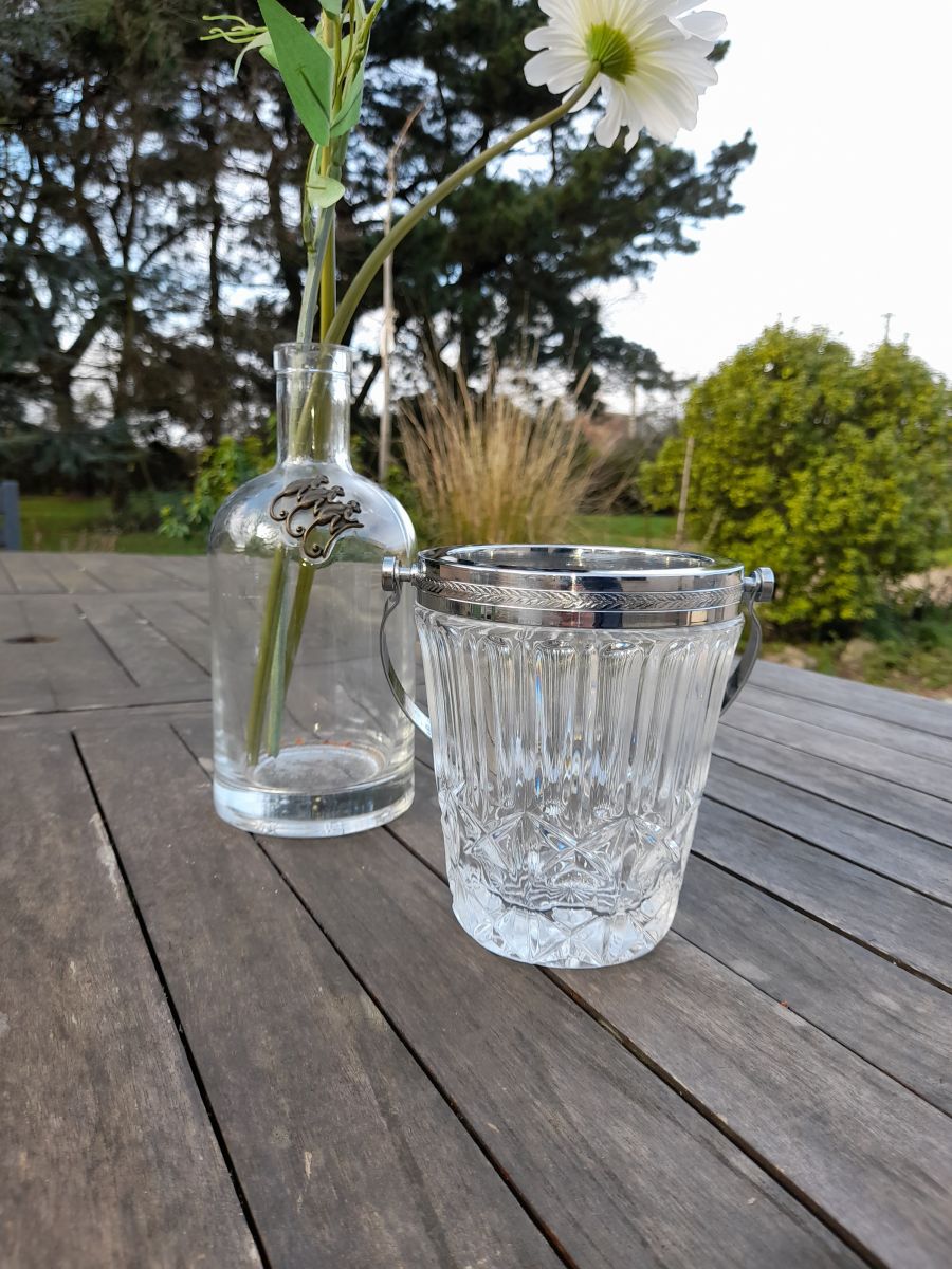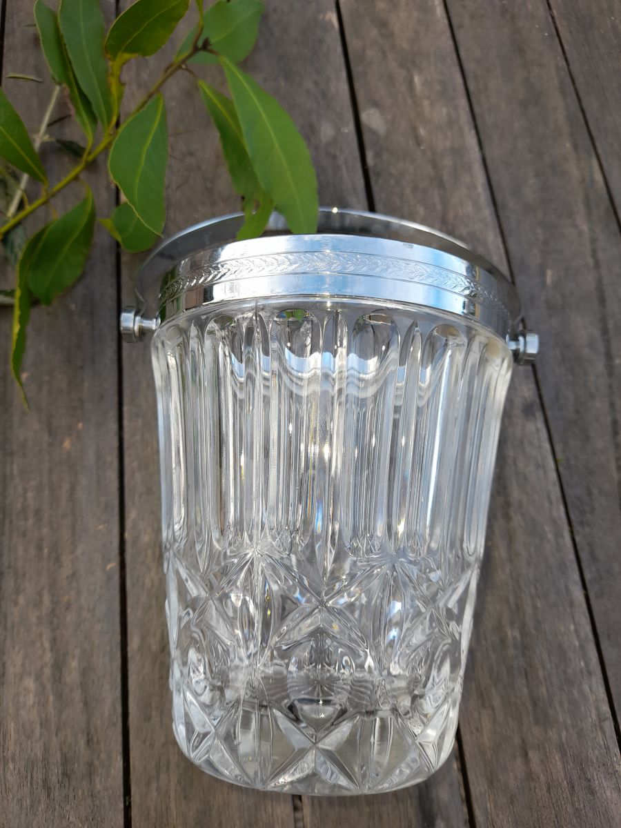 Seau à glaçon, anse et entourage ciselé en métal argenté.