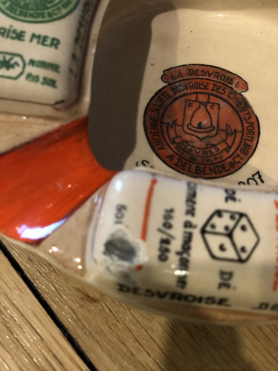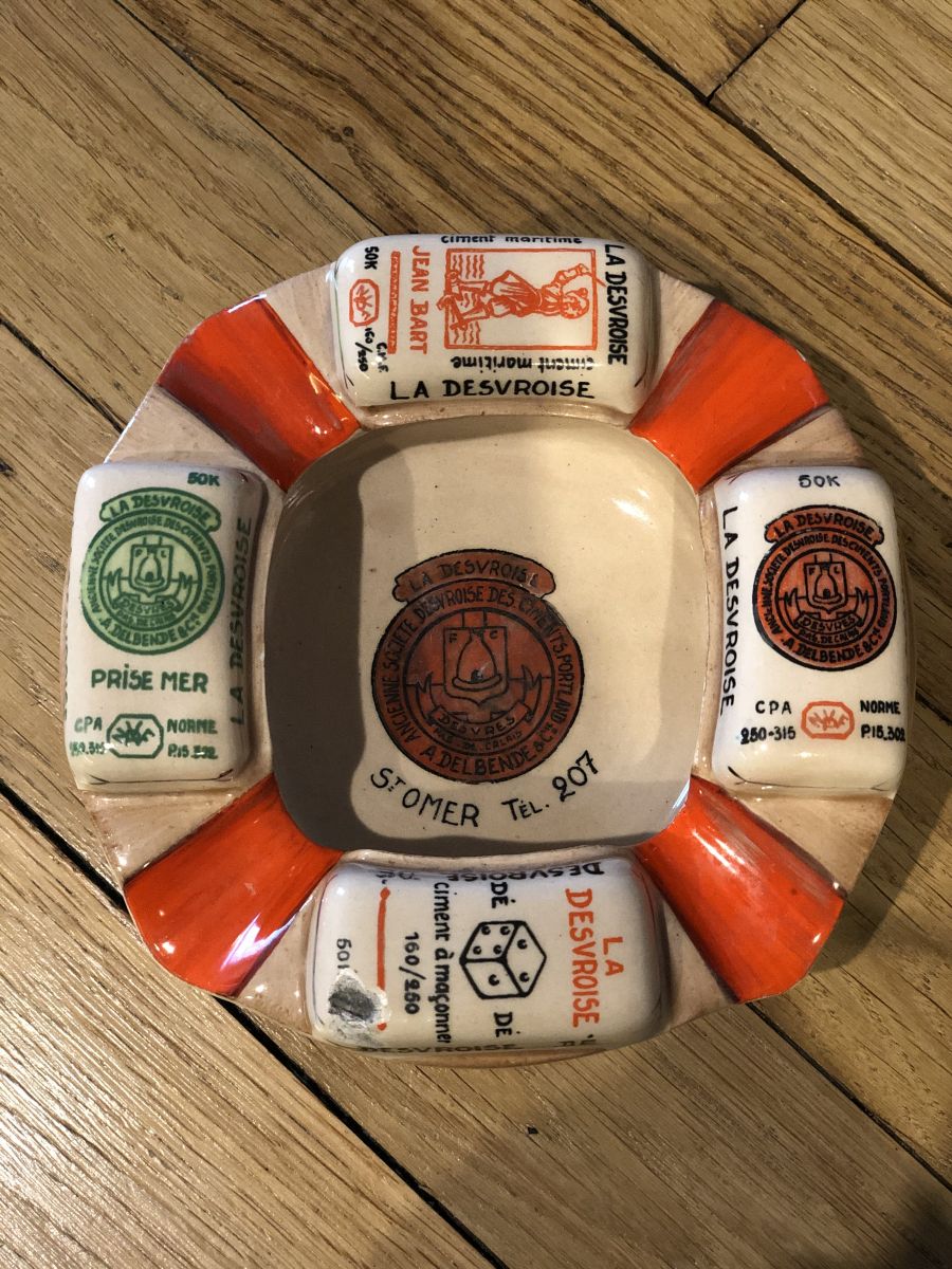 Ancien cendrier publicitaire émaillé très lourd de la cimenterie LA DESVROISE Anciennement Société Desvroise des Ciments Portland : A.DELBENDE & Cie à St OMER Tél : 207.