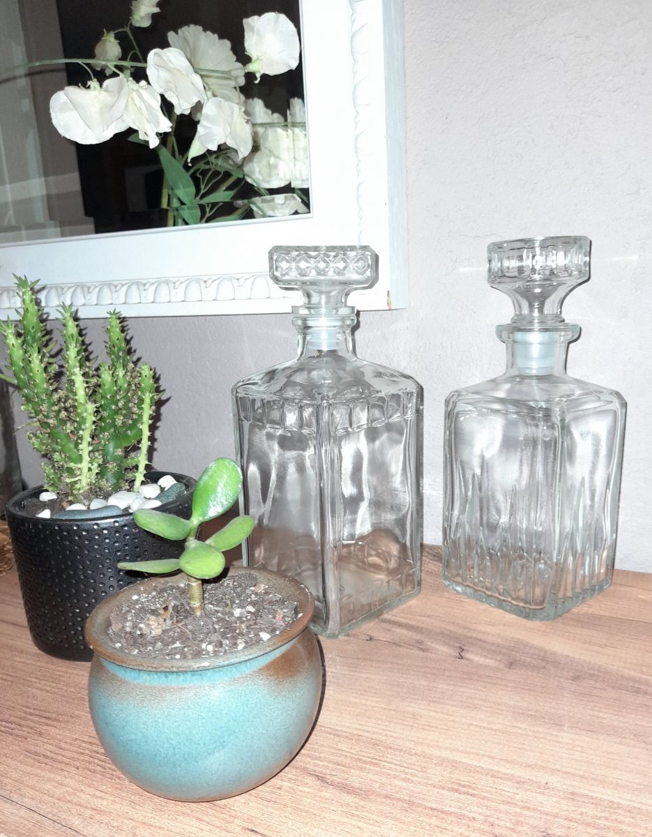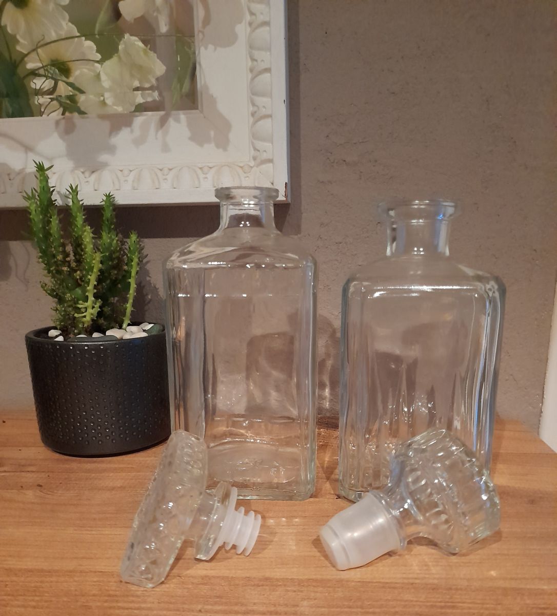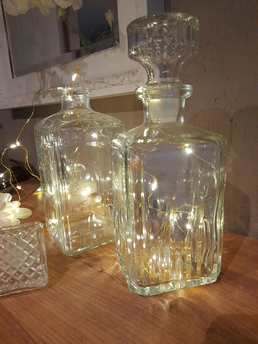 Ces 2 carafes seventies au style épuré forme un bel ensemble pour être détourné en objet de déco tel un soliflore ou en points lumineux et cosy pour ambiance feutrée et chaleureuse en y glissant une guirlande led comme sur les photos par ex.