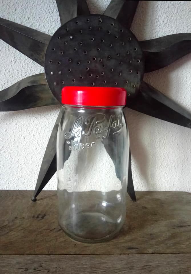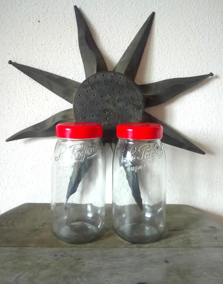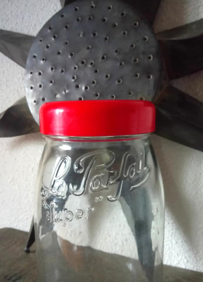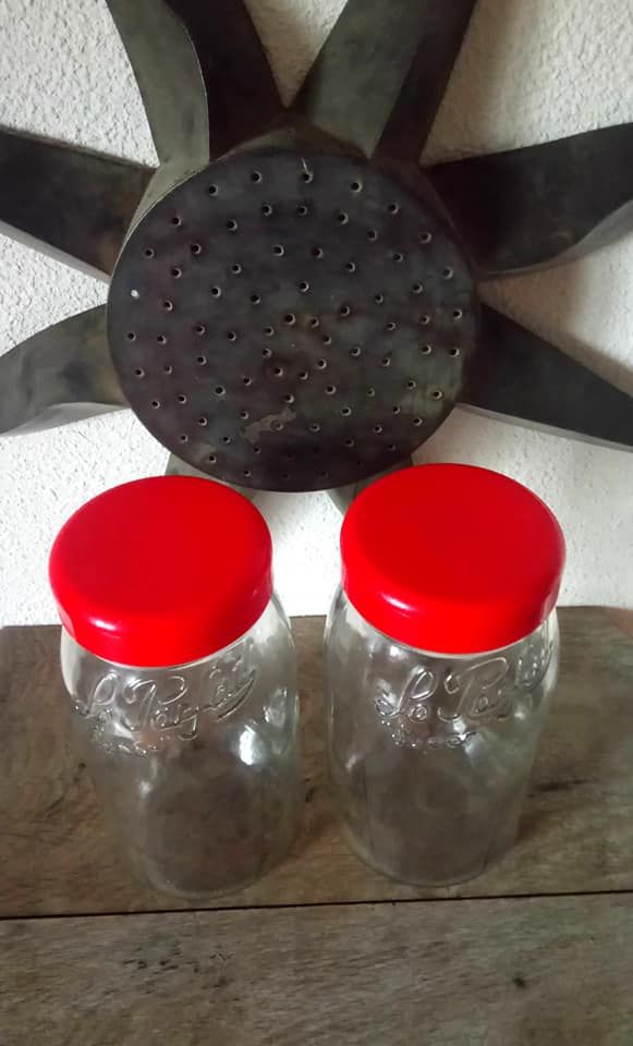 Deux bocaux de conservation "Le parfait super" avec leurs couvercles à vis en plastique rouge