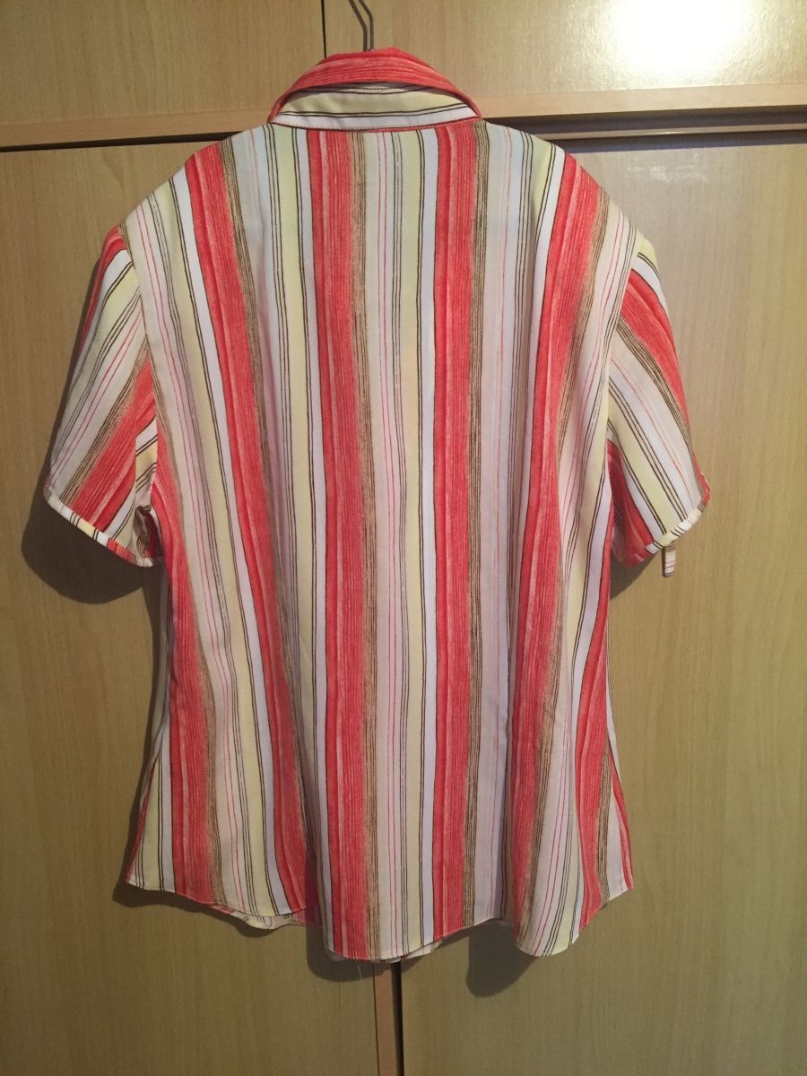 Base arrondie, cintré au dos, pinces poitrine, épaulettes, boutons fantaisie, tissu 100 % polyester rayé corail, jaune, blanc, marron