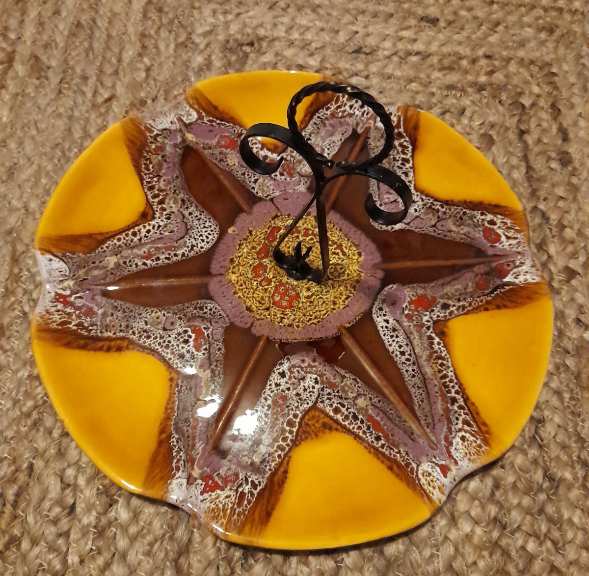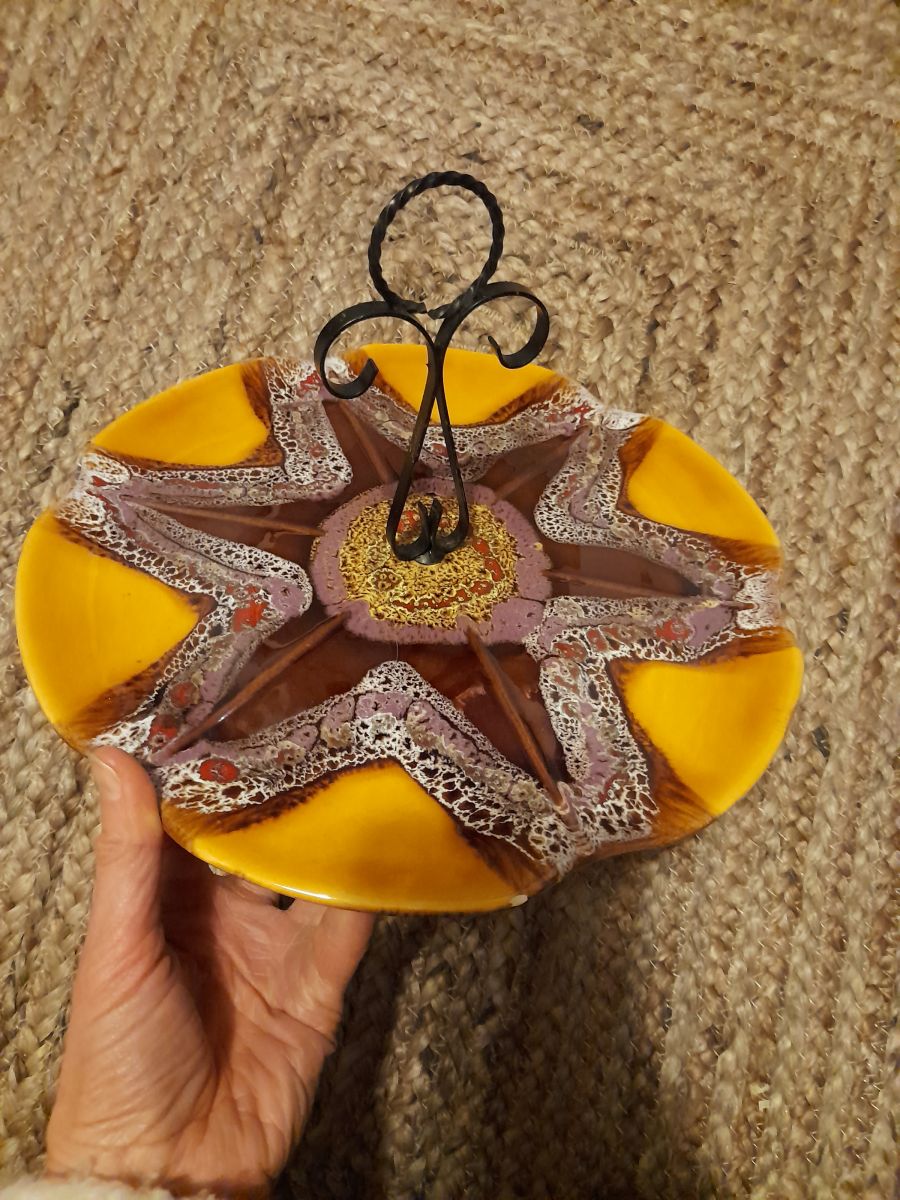 Peut servir de plateau à fromage mais pourquoi pas le détourner en plat à mignardises pour apéro, ou à sushi. Sa forme et ses motifs géométriques sont typiques du courant artistique de la céramique Vallauris de cette époque.