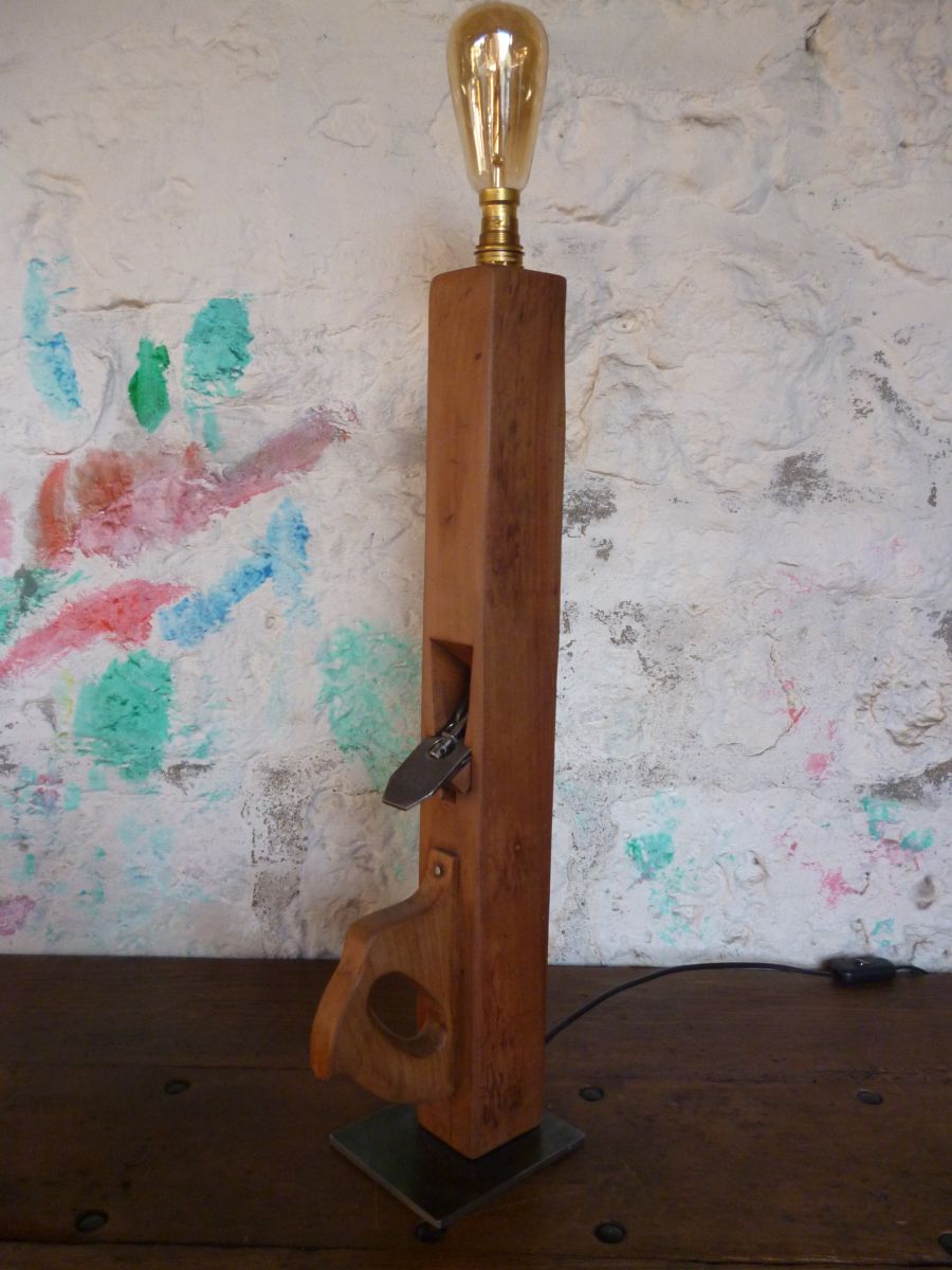 Lampe au design industriel realisee a partir d'un ancien outil de menuisier . ( varlope ).