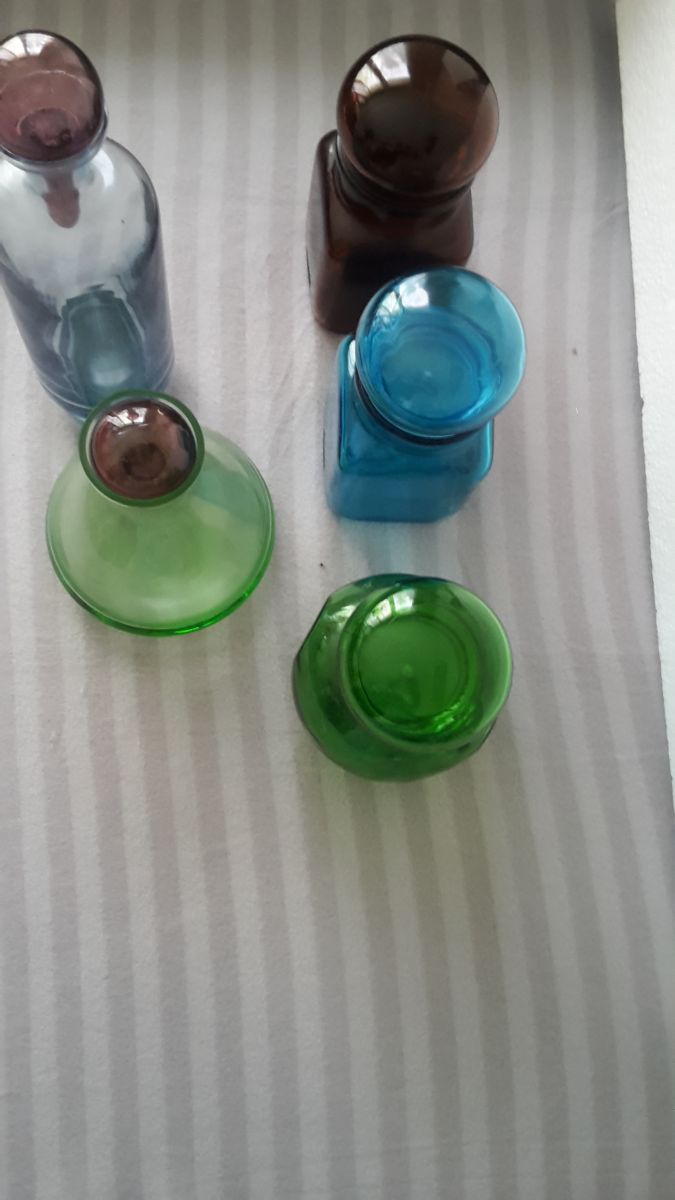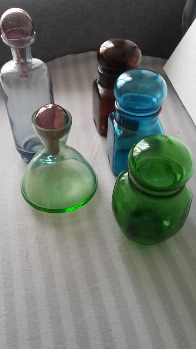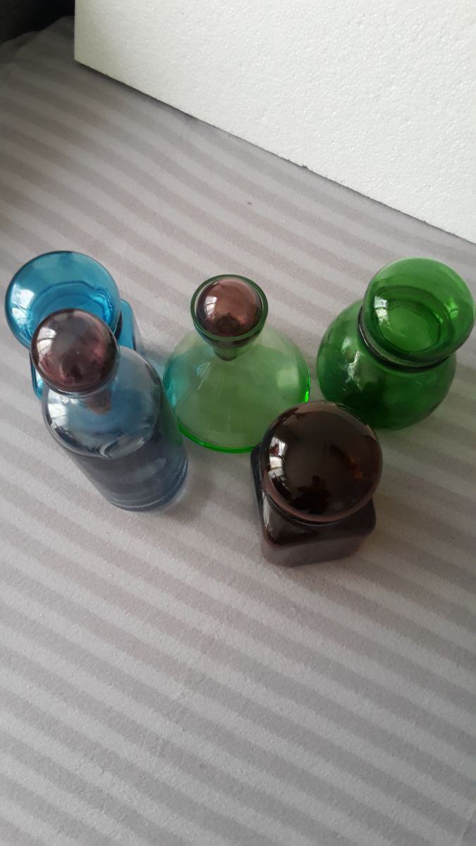 5 Pots de pharmacie, le bleu et le marron sont de "Dach". Le verre est de "Lever'.
