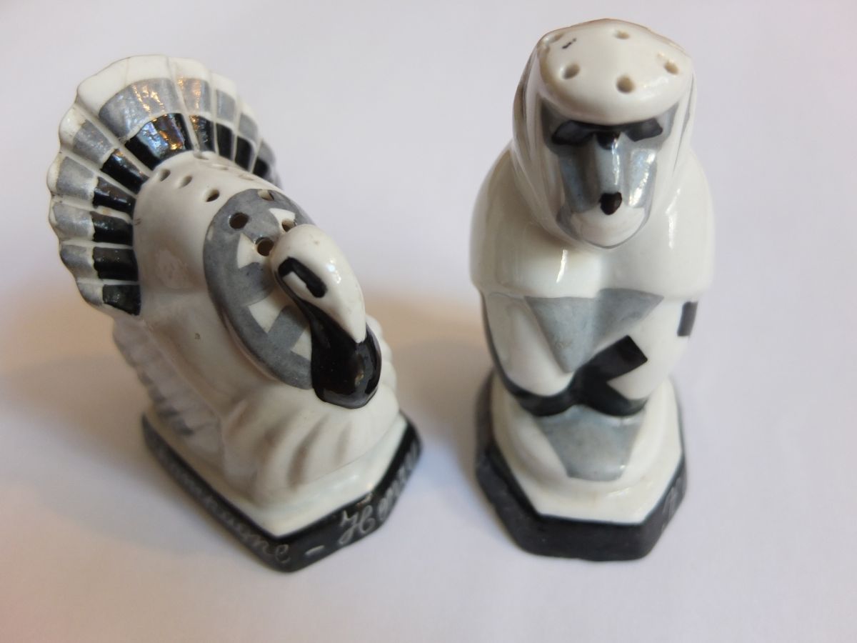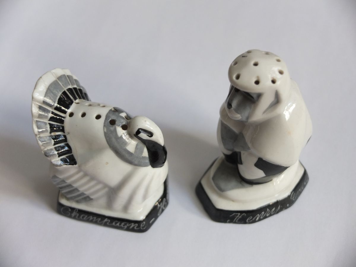 Deux salières en porcelaine, figurant un dindon et un singe.