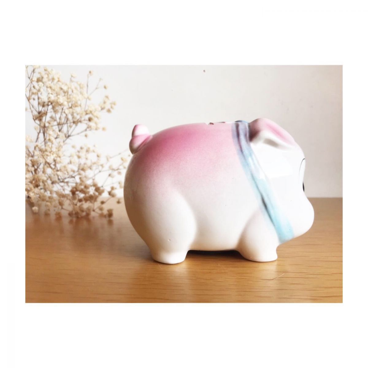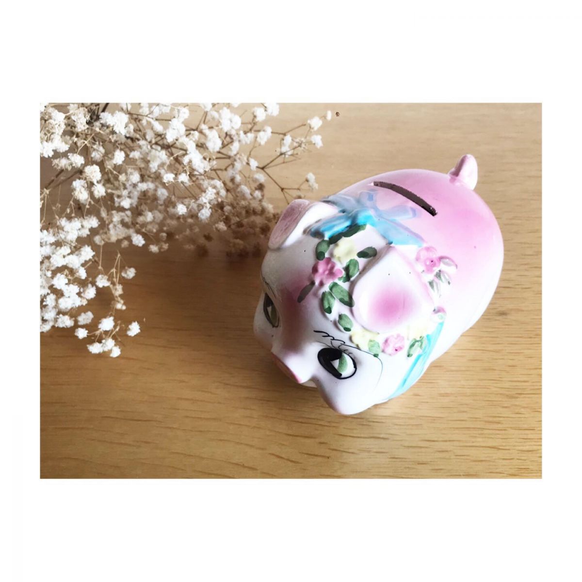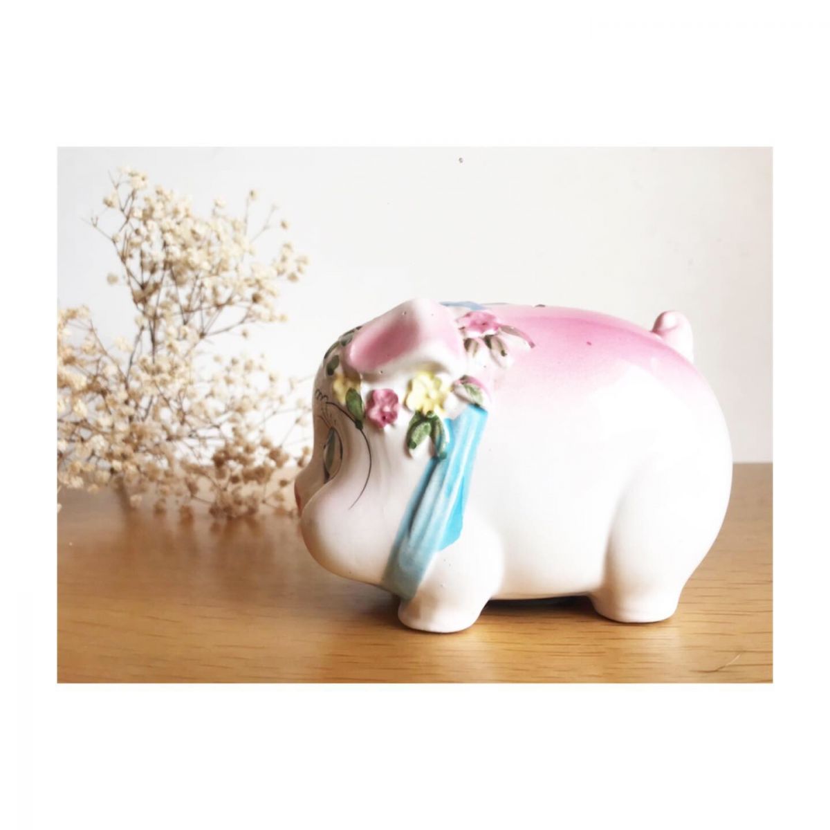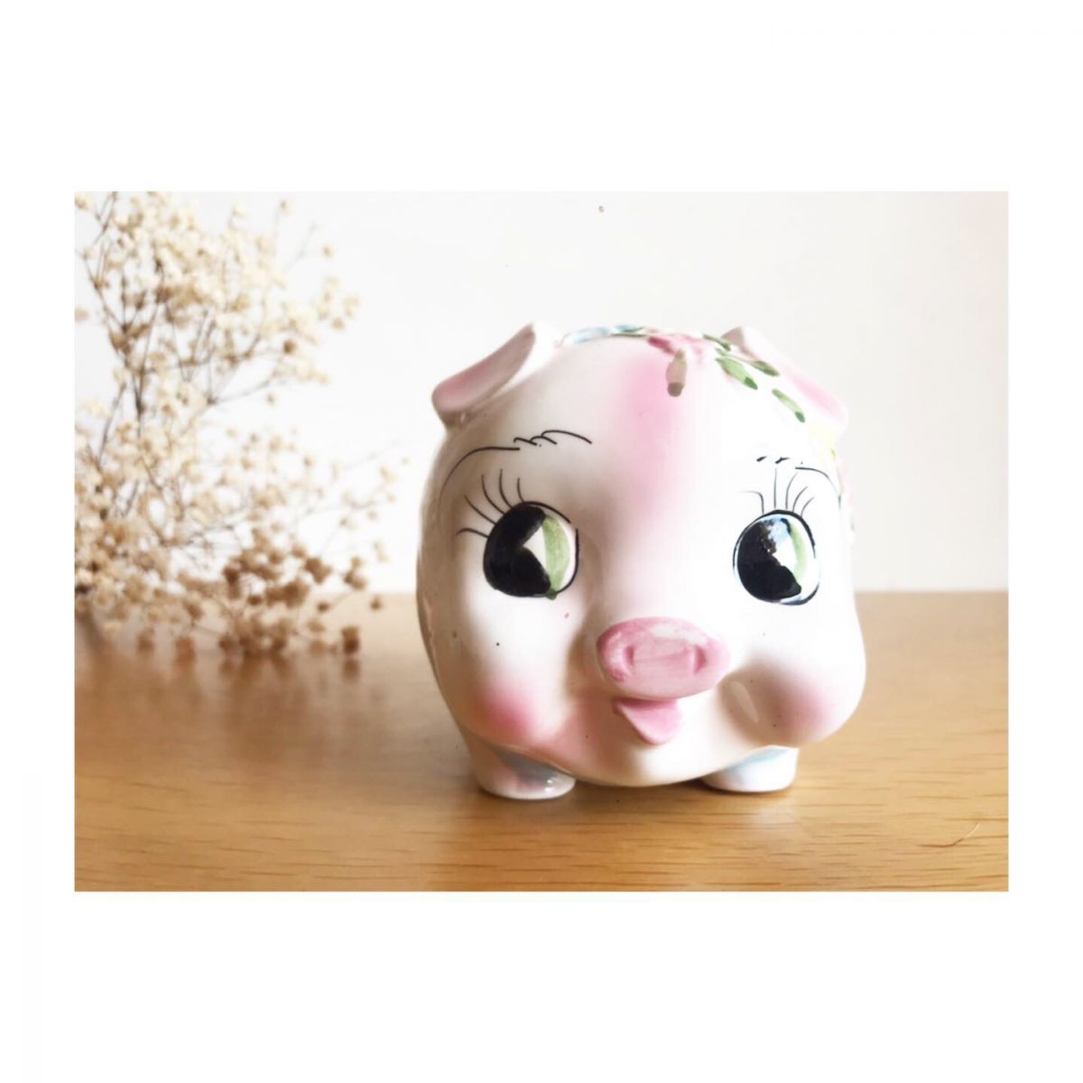 Adorable petite tirelire cochon en porcelaine avec de jolies couleurs et un regard facétieux.