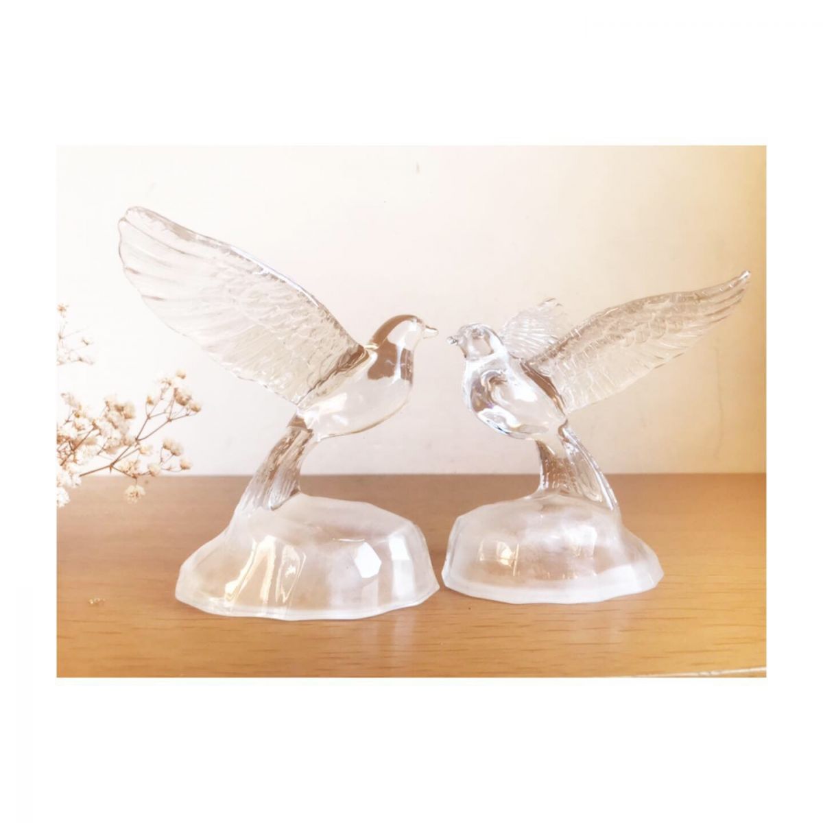 Un très joli couple de colombes en cristal d’Arques posées sur un rocher en verre givré.