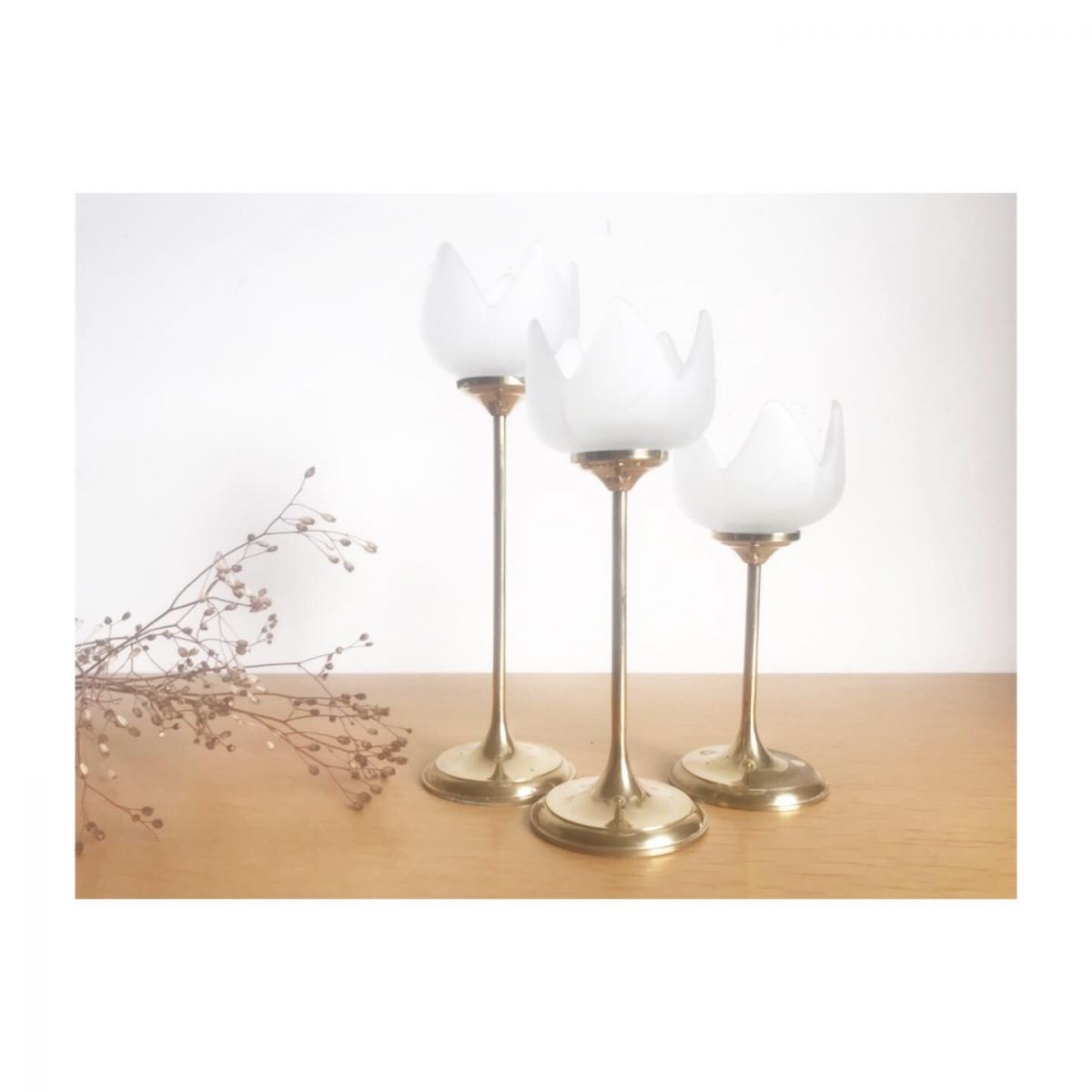 Trio de bougeoirs fleurs en laiton et verre vintage