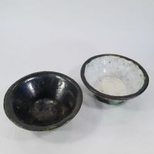 Cendrier en métal (peut-être argenté car il y a une inscription 308) et en verre. Largeur du cendrier en verre est de 8 cm. Le métal est un peu piqué et le verre en parfait état.