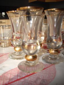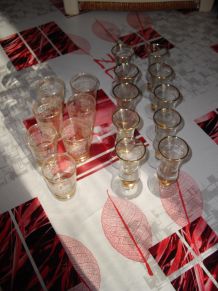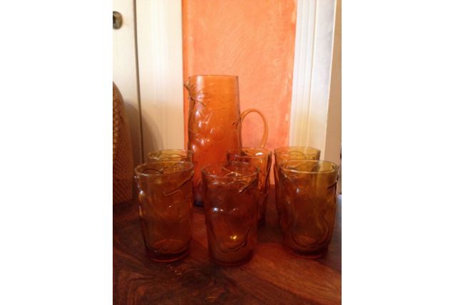Service à orangeade année 70, les verres sont en très bon état, par contre la poignée de la carafe est abîmée, cela ne voit pas donc idéal en décoration, mais elle ne tiendra pas si on la porte avec la poignée.