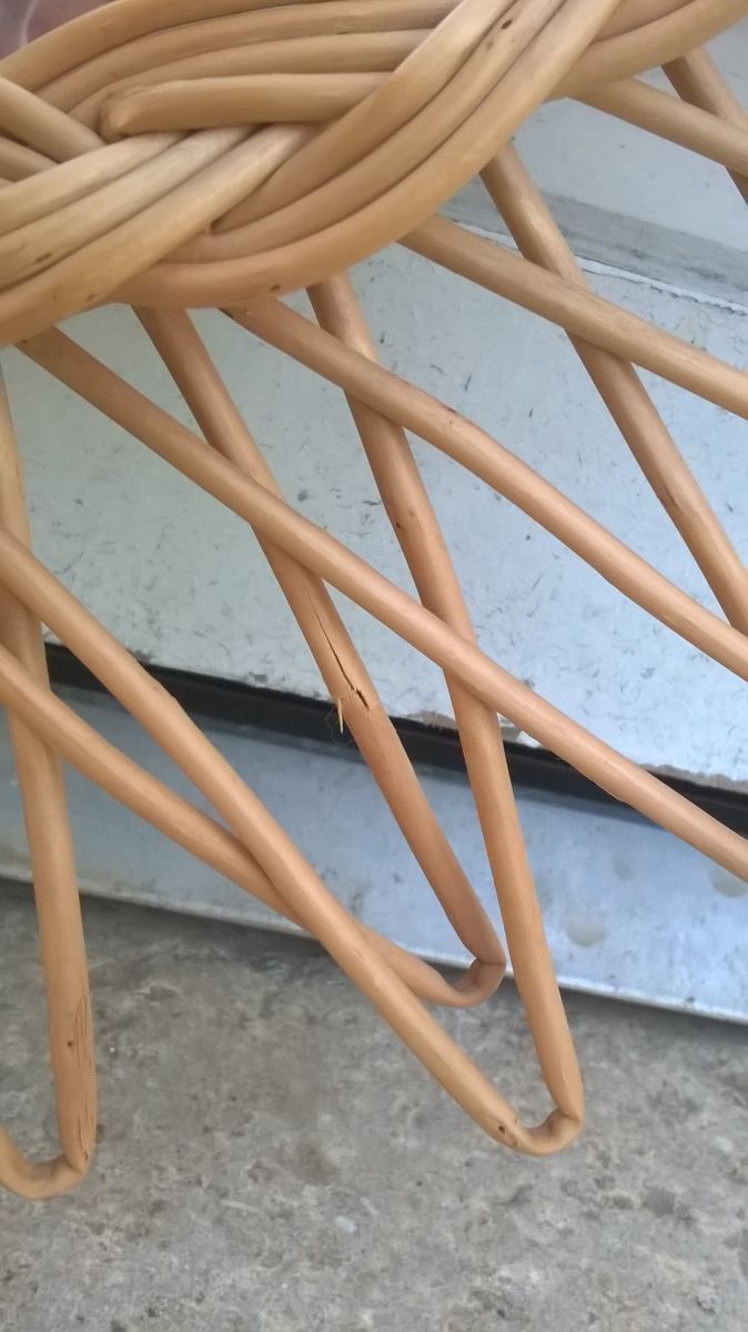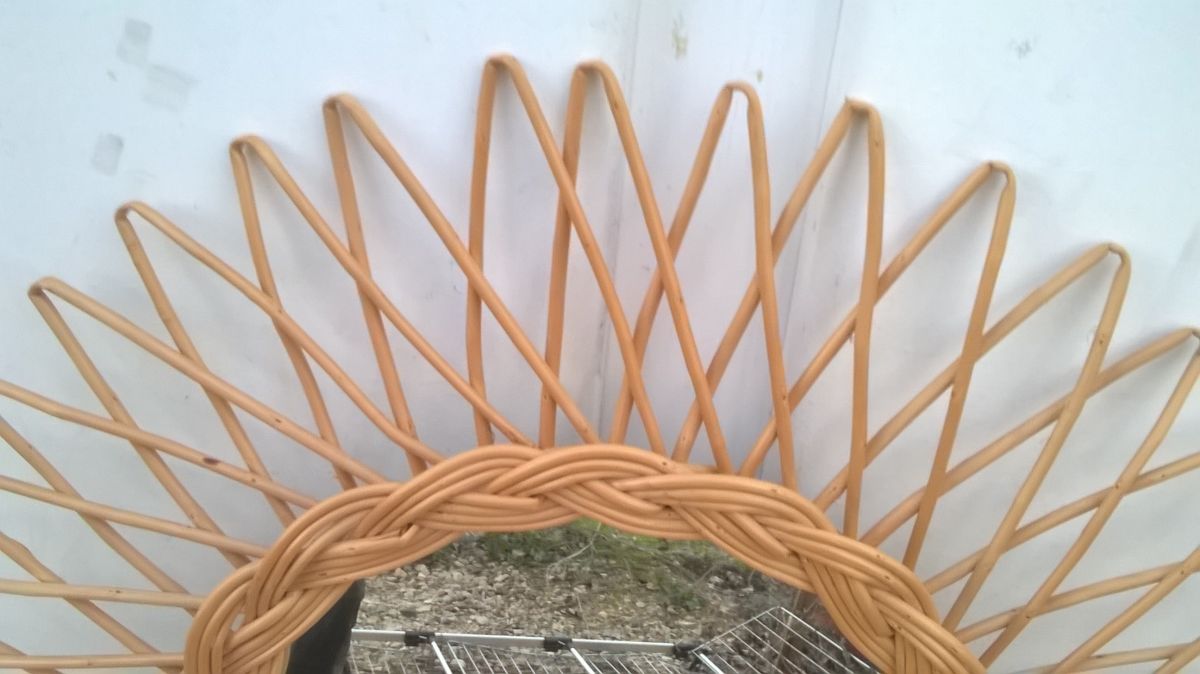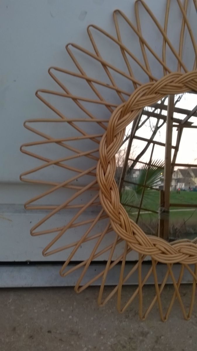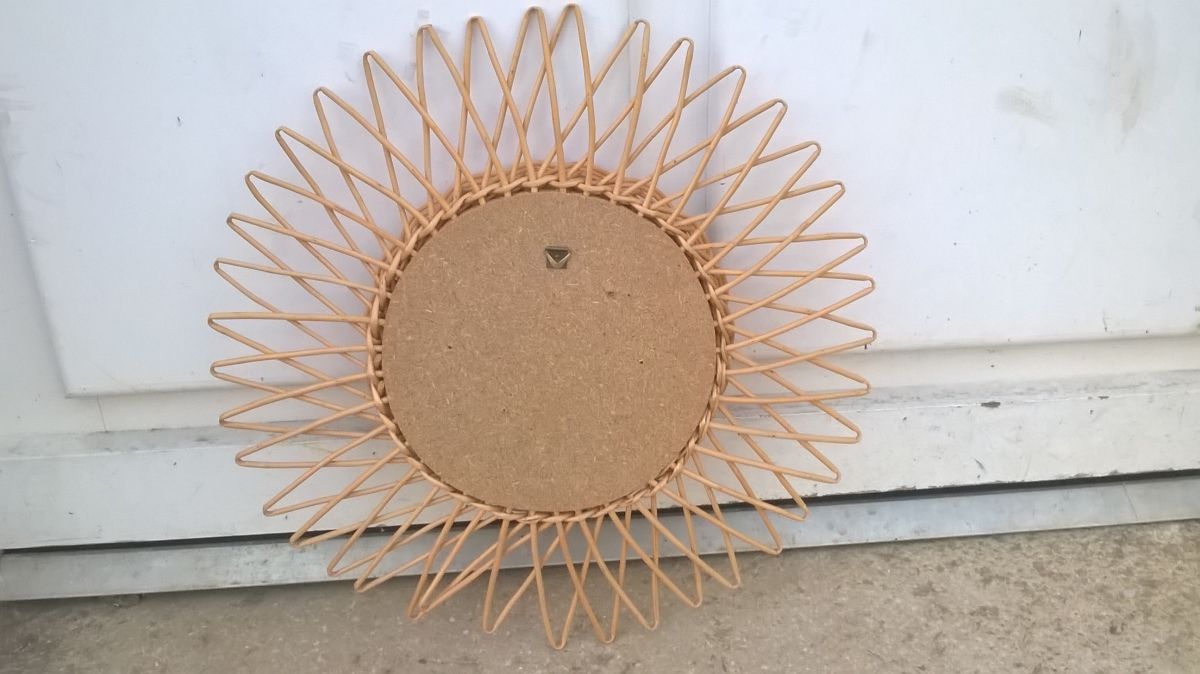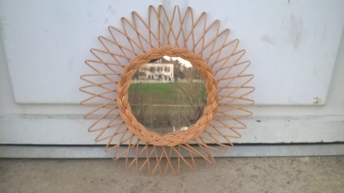 Miroir soleil en rotin tressé 1960. Diamètre totale 41 cm. Diamètre miroir 18 cm. Hauteur 3 cm. Petit fêle sur une branche. Très bonne état.