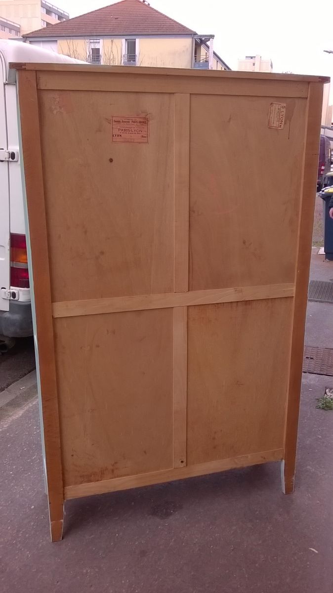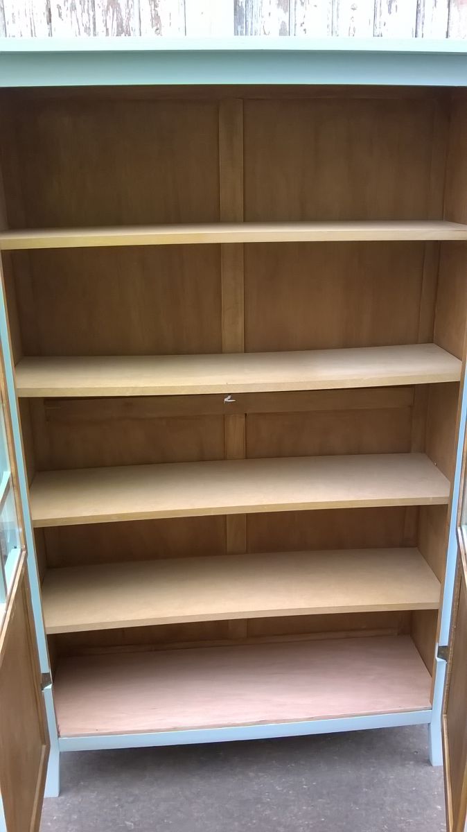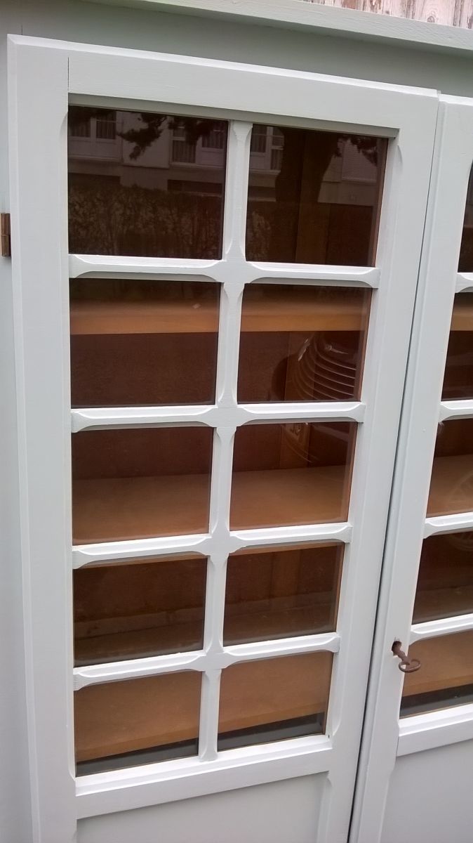 Petite armoire vitrine parisienne couleur vert mint. Elle a été poncé et repeinte. A noté la serrure est un peu capricieuse par moment. Hauteur 161 cm, largeur 103 cm. Profondeur 31 cm et 34 cm avec l épaisseur des portes.