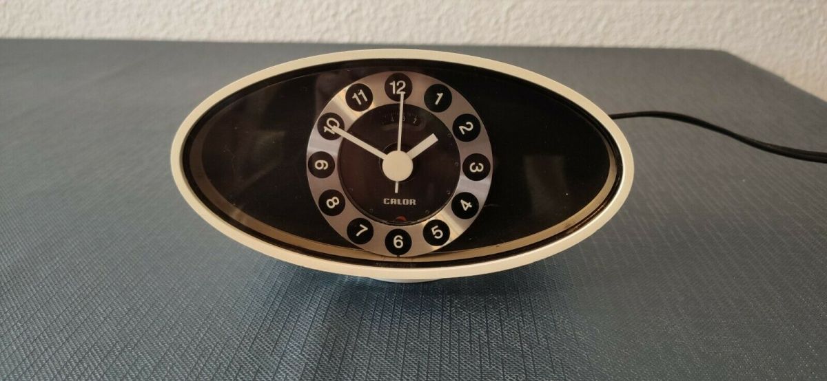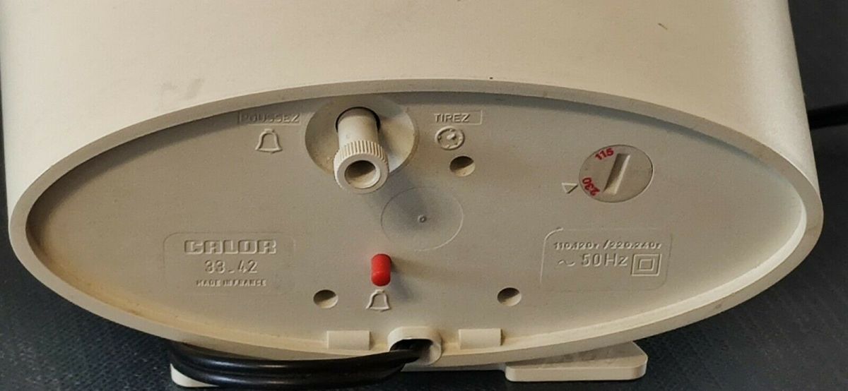 Réveil électronique design Calor des années 70. Fonctionne en 110/220v. Arrêt de la sonnerie non stressante par appui-bascule. Modèle 33-42 blanc crème. Fonctionne parfaitement.