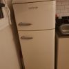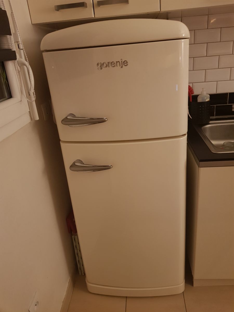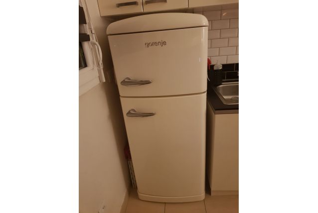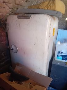 Bonjour , le frigidaire est crème disons blanc cassé , le congélateur fonctionne bien , c'est plus pour le prendre en déco rangement , car le joint de la porte est abimée et impossible de le changer sur ce modèle . Hauteur je dirai plus 1.48 avec la partie arquée . Merci