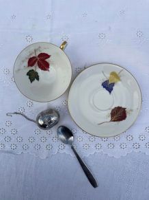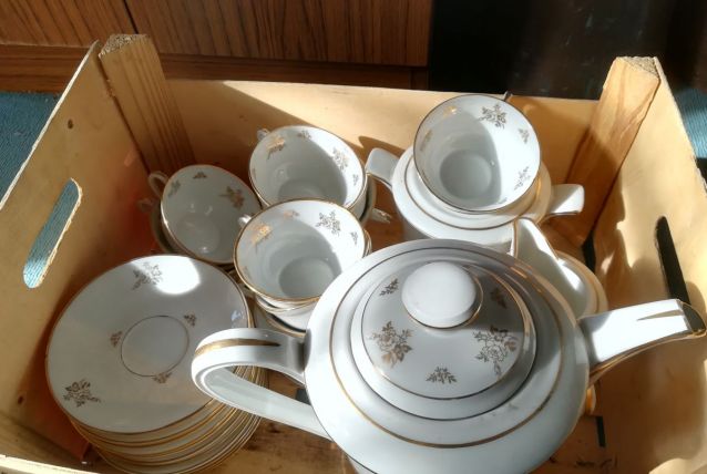 Service à the comprenant 11 tasses 8 soucoupes 1 sucrier 1 pichet à lait 1 théière 12 petites assiettes 8 soucoupes fleuri liseré dore art déco.