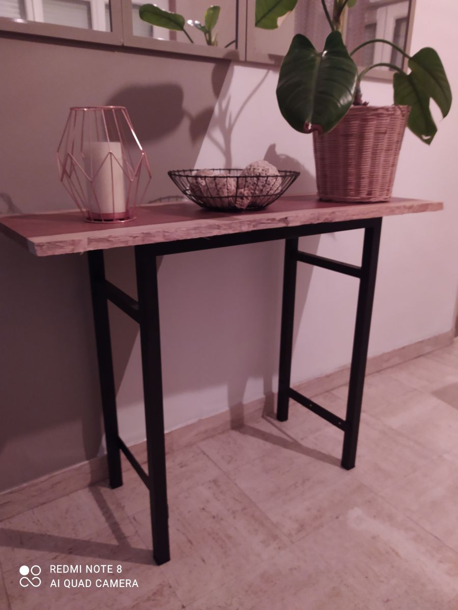 Console avec pied acier noir mat soudé sur base d un ancien bureau qui a été recoupé