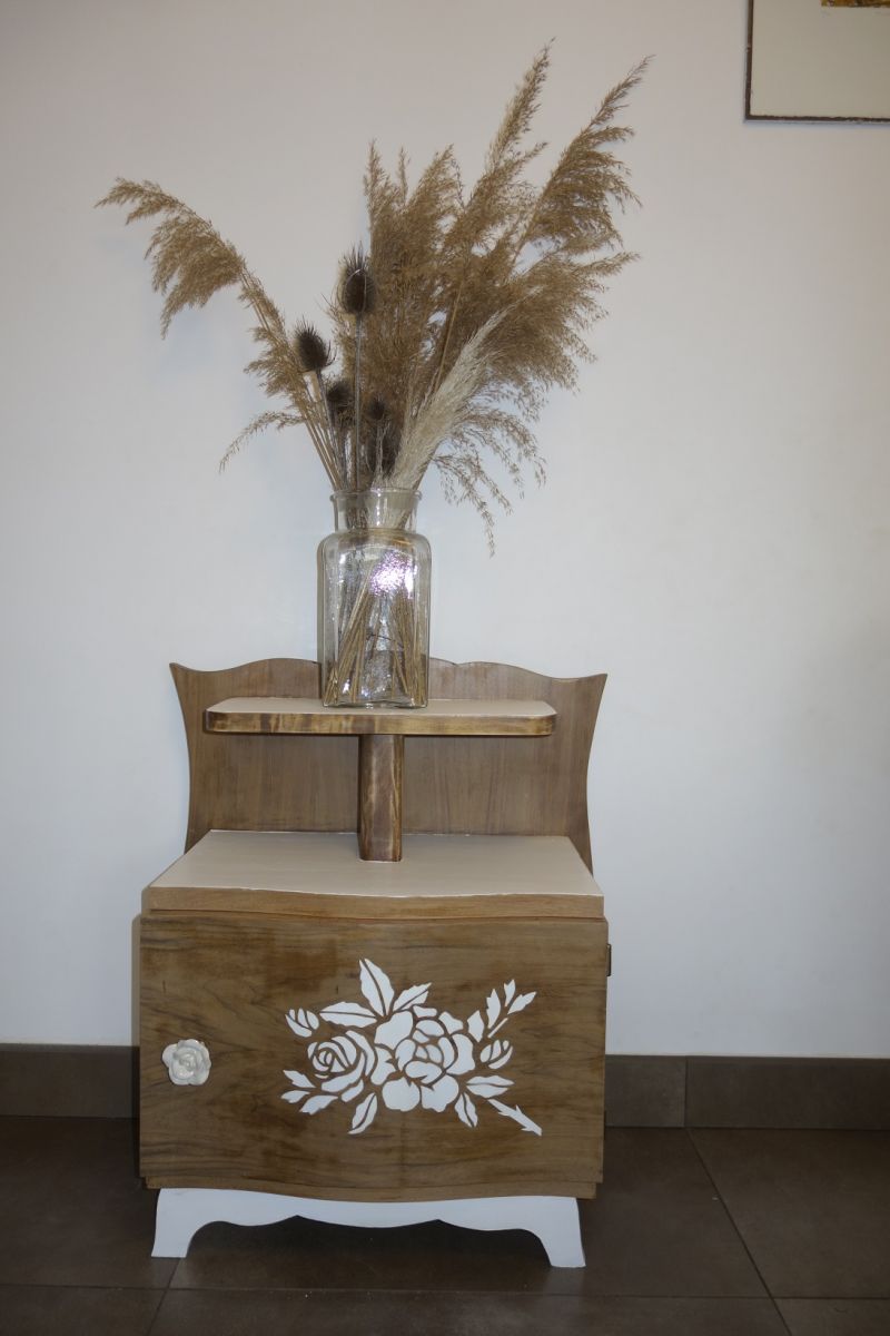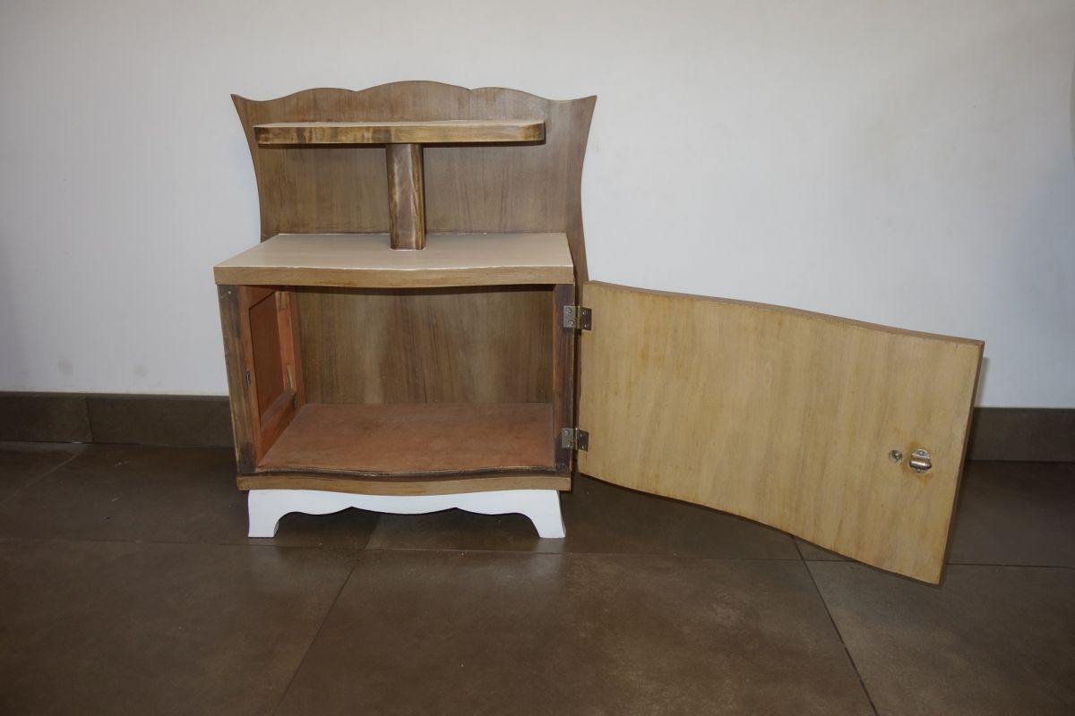 Meuble de chevet ou autre, art déco, relooké et vernis. Bouton de porte ancien en porcelaine. Quelques petites irrégularités sur la tranche.