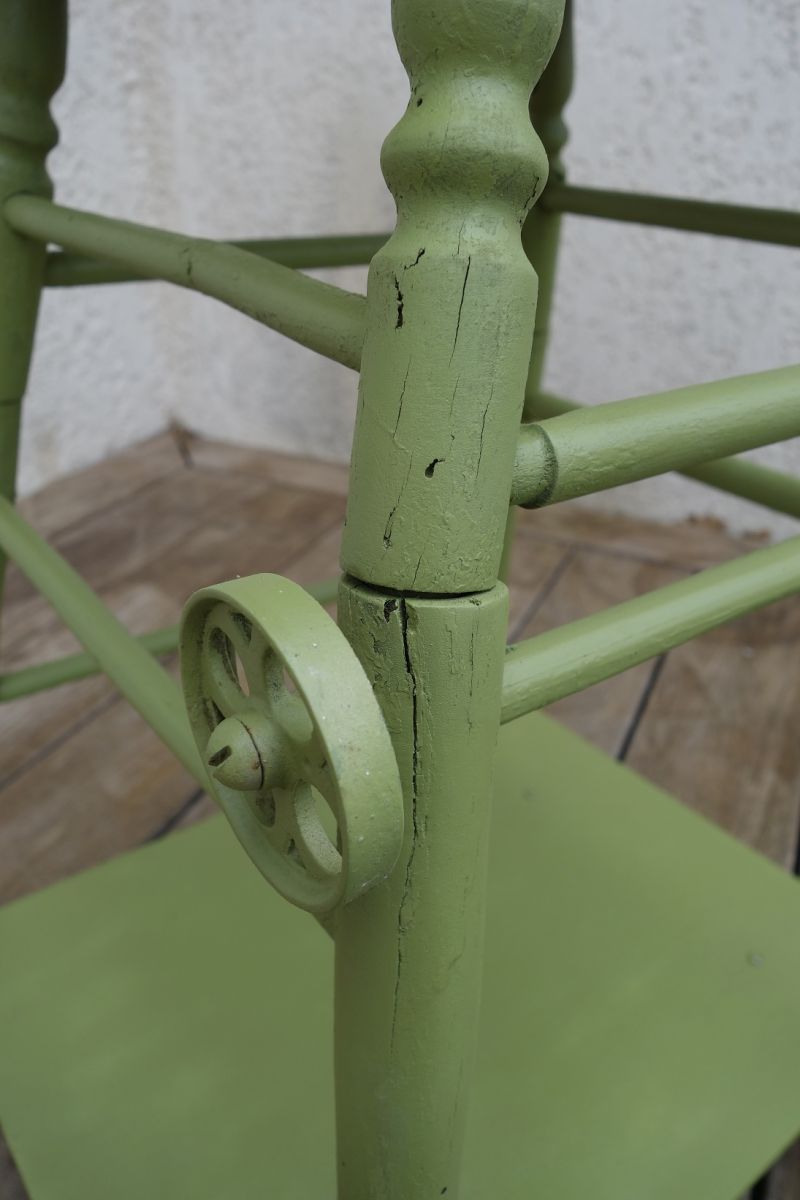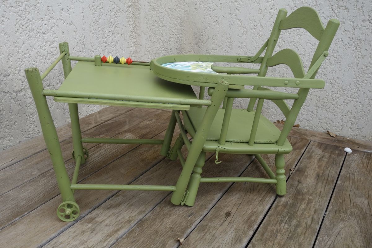 Chaise haute ancienne de marque Baumann, transformable en petit chariot. A utiliser en décoration car elle n'est plus très stable. J'ai changé les planches qui étaient très abîmées et repeint le tout. Elle porte les marques de son âge mais c'est ce qui fait son charme!