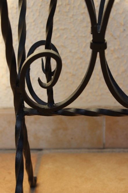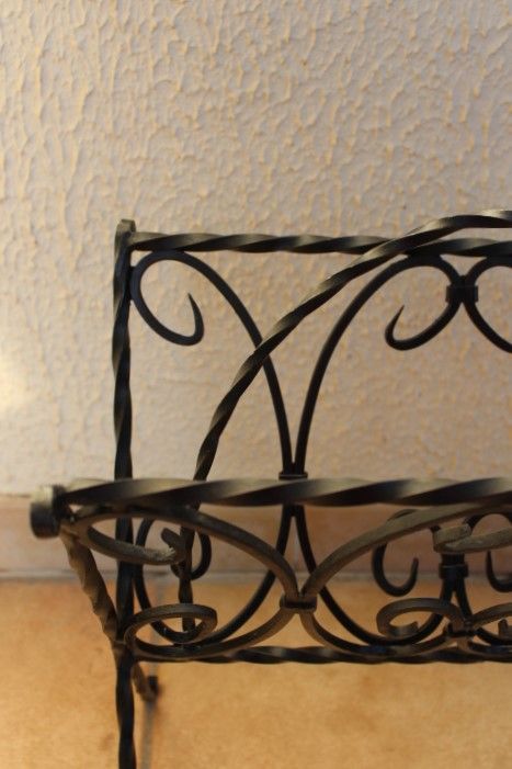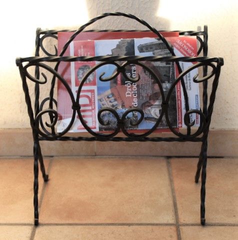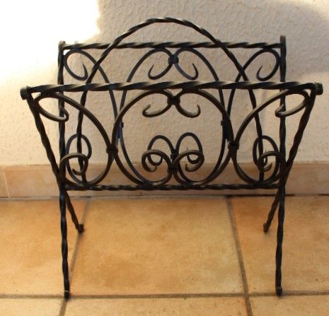 Porte-revues en fer forgé des années 50/60 typique de cette période, avec son fer forgé torsadé et ses volutes décoratives.