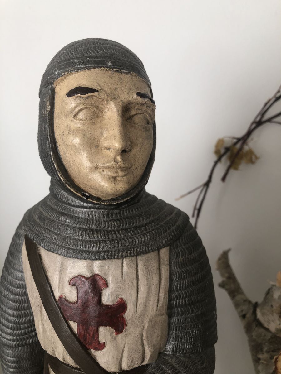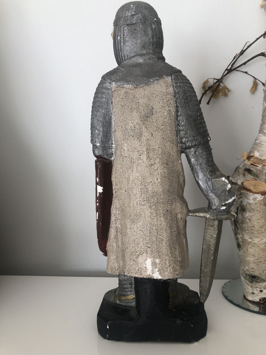 Statue de chevalier médiéval en ciment et plâtre polychrome signée Jean Loup DELAROCHE