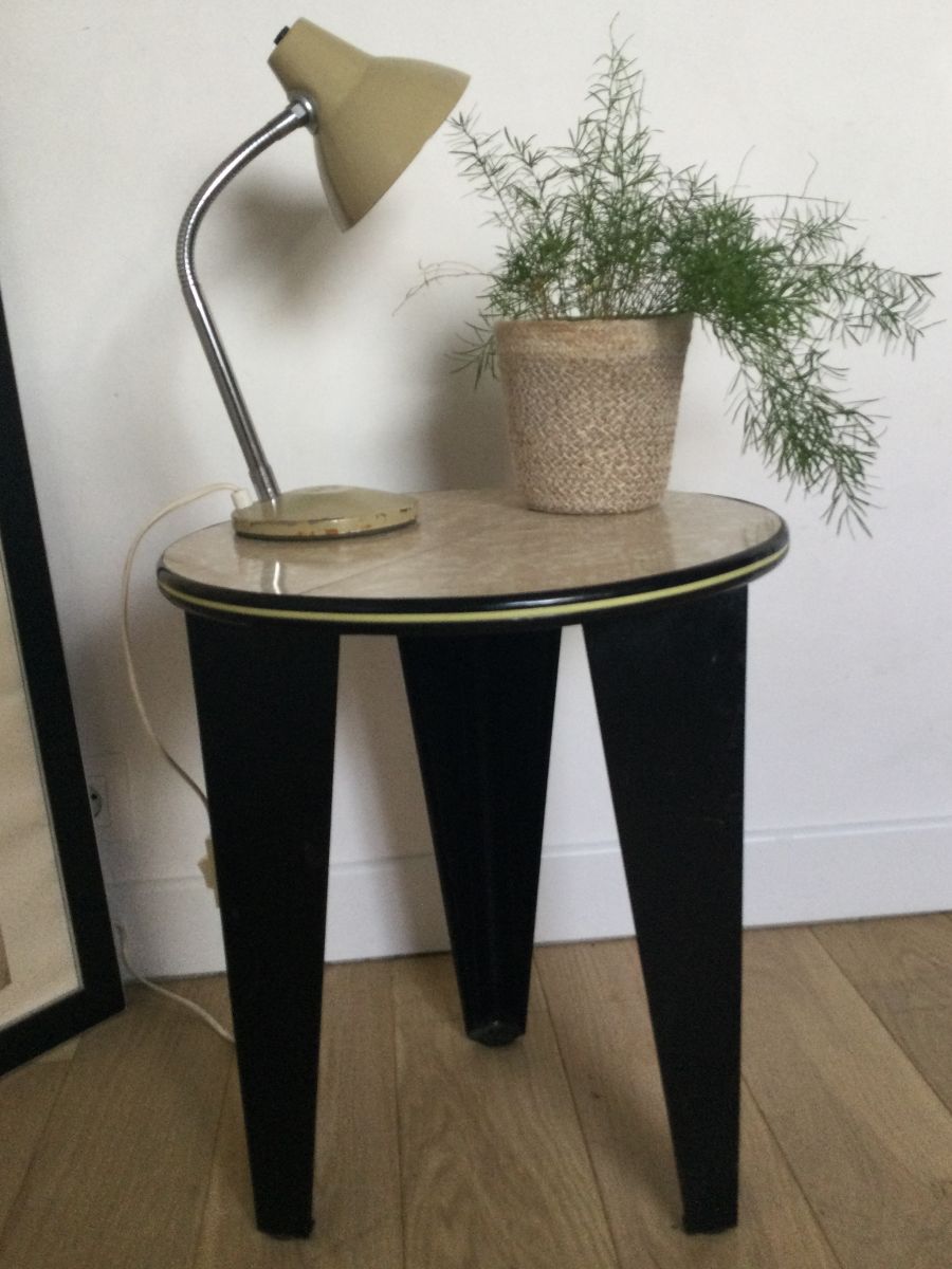 cette table aux pieds compas en métal plié possède un plateau en Formica et elle est en très bon état .