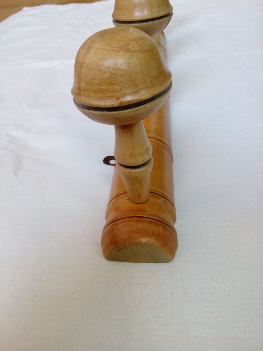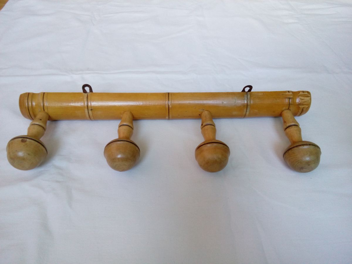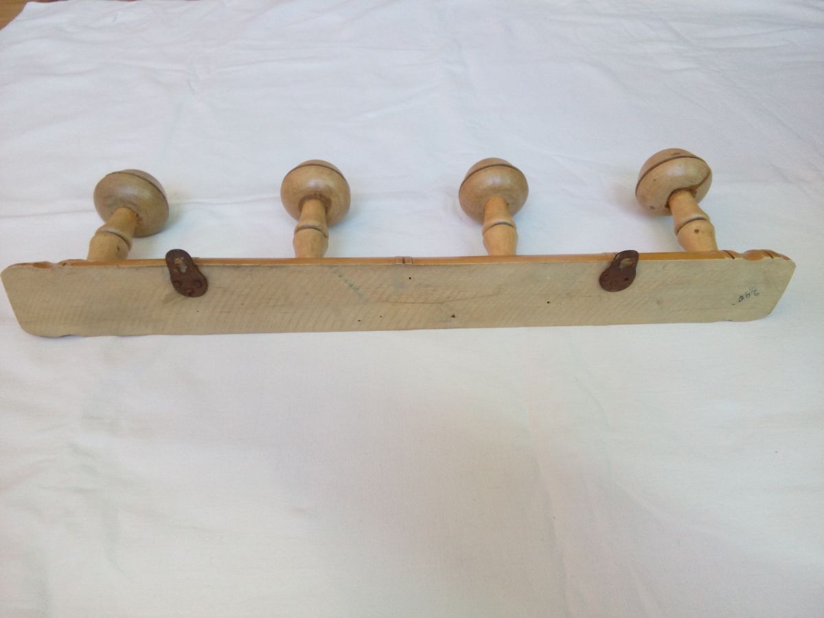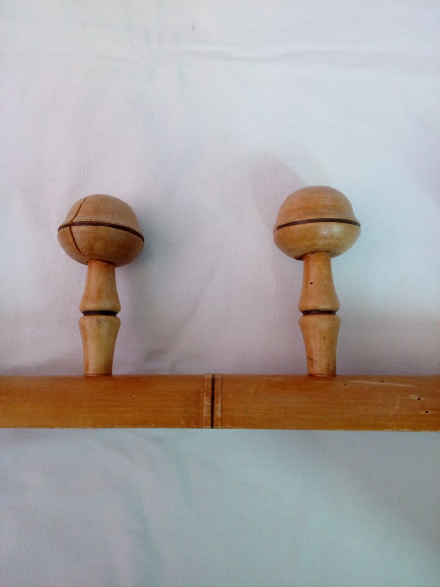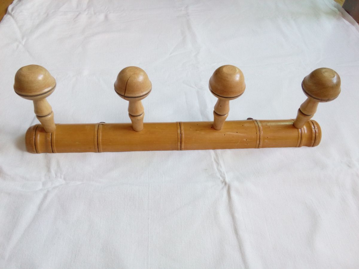 Porte-manteau mural tout en bois massif tourné avec de jolies formes arrondies et des cercles foncés (colorés par brûlure peut-être ) pour un design qui imite l'aspect du bambou. La forme en champignon des patères est particulièrement harmonieuse. Il doit dater des années 50 ou peut-être avant. Il est encore solide, mais ne cache pas son âge : quelques trous anciens de vrillettes que j'ai traité par injection de vinaigre blanc, des marques, taches et éclats. Et une fissure sur l'une des patères, mais ça reste solide, la tête ne bouge pas. Sur les patères, le vernis s'écaillait complètement : je les ai donc poncées légèrement puis j'ai passé une très fine couche de vernis aspect satin (couleur chêne clair) pour les protéger de l'humidité d'un manteau mouillé, tout en évitant le côté brillant qui nuirait à sa jolie patine. Il est muni de ses deux accroches d'origine, en métal, un peu déformées et oxydées mais toujours solides. Il mesure 47 cm de long, pour 5,4 cm de large, et 13,5 cm de profondeur champignons compris, l'épaisseur maximale de la planche est de 3 cm. Ce porte-manteau pèse 575g.