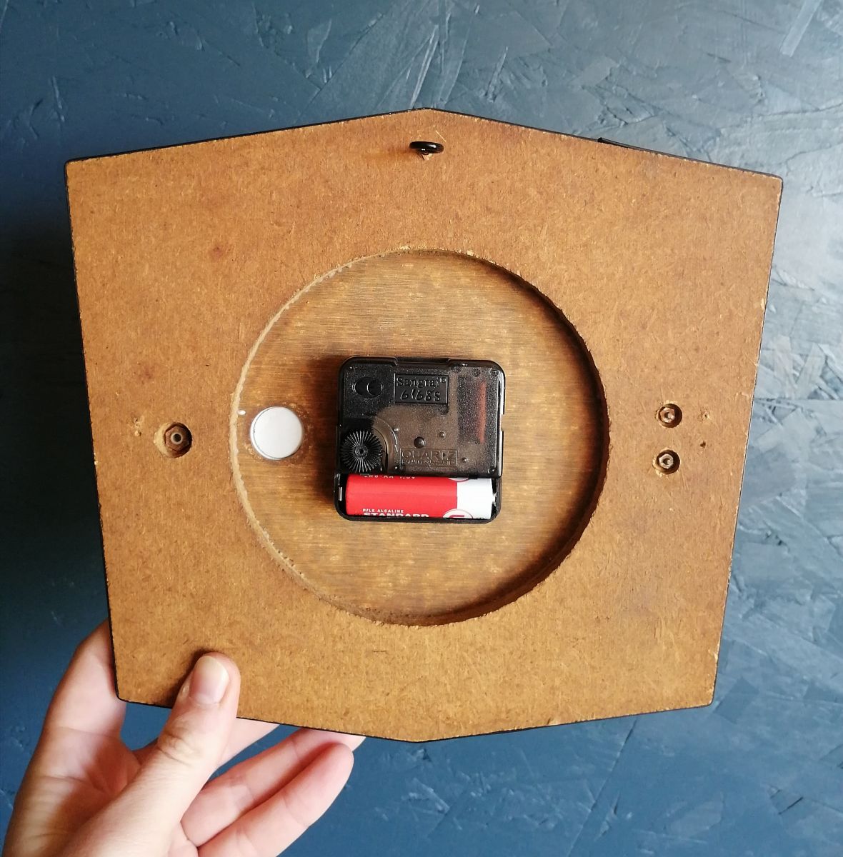 Pour préserver votre tranquillité, j'ai choisi un système silencieux qui fonctionne avec une pile alcaline AA et qui vous sera fourni pour l'installer dès sa réception. Le mécanisme (situé à l'arrière de l'horloge) a une petite mollette qui permet de régler l'heure.