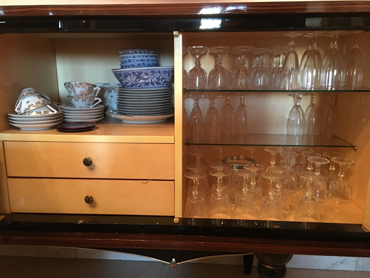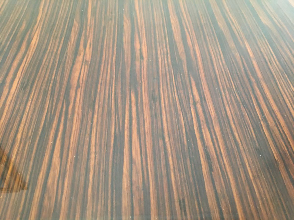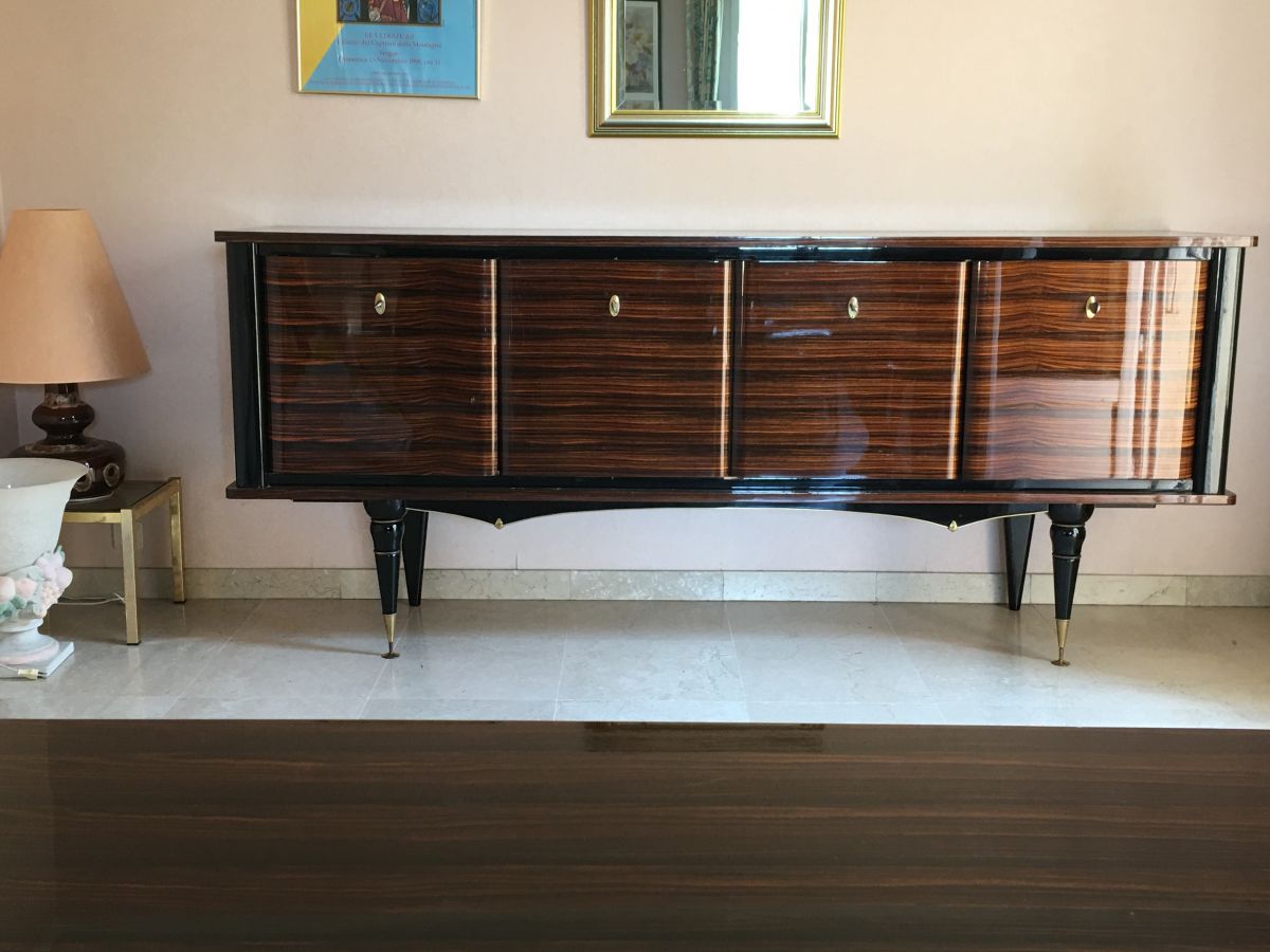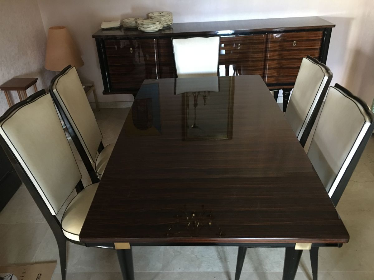 Le dessus de la table et la façade de l'enfilade est un placage d'ébène de Macassar , essence de bois aujourd'hui introuvable car le Macassar est une espèce protégée.