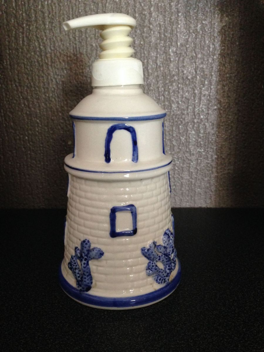 Pompe distributrice a savon liquide . Contenance 200 ml Forme de phare de couleur bleu et blanc