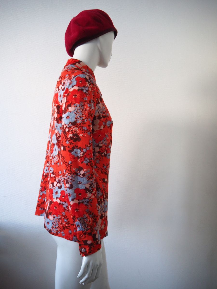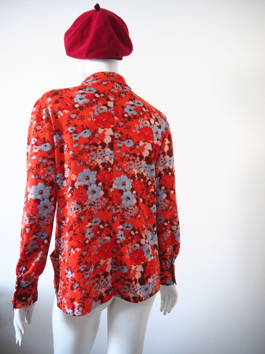 Jolie chemise orange avec des motifs fleuris rouges et bleus ciel datant des années 1970.