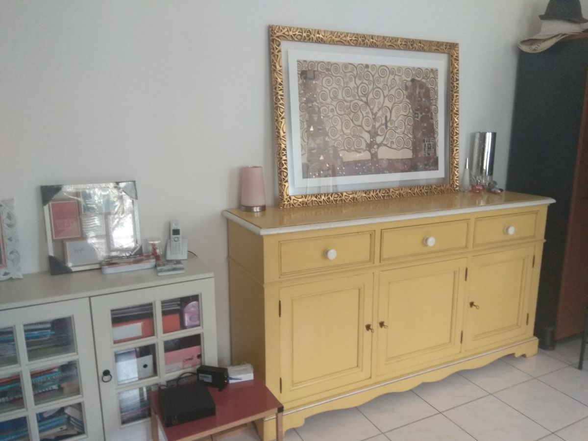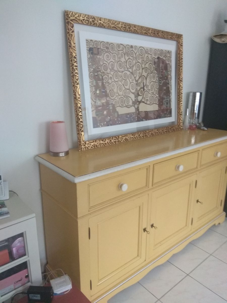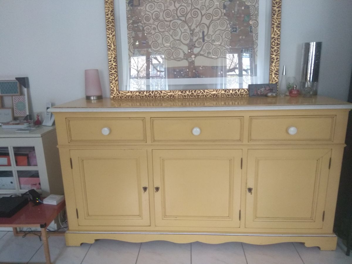 Je vends un beau buffet en bois massif style provençal vintage couleur jaune et blanc en très bon état, conçu avec 3 larges tiroirs et 3 portes avec 1 étagère.