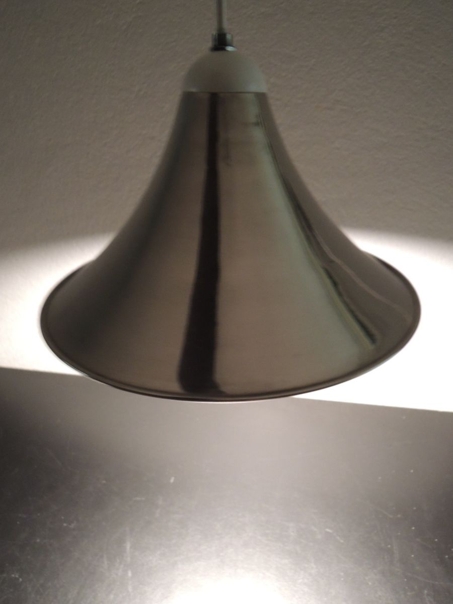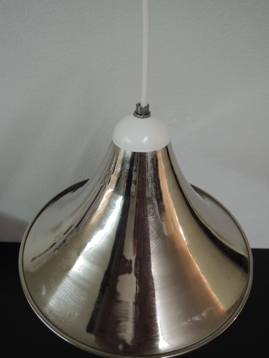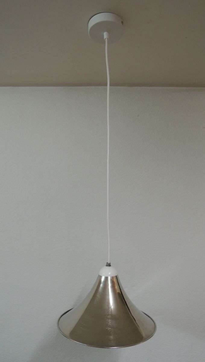 Suspension trompette en métal chromé. Équipée d'une douille à vis (type E14), électricité refaite (douille et câble neufs). Pavillon cache en métal blanc.