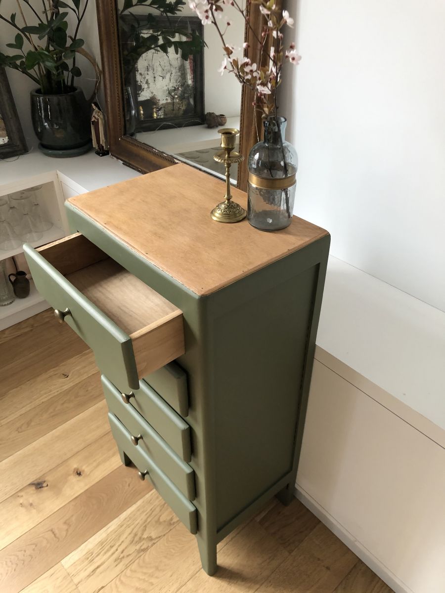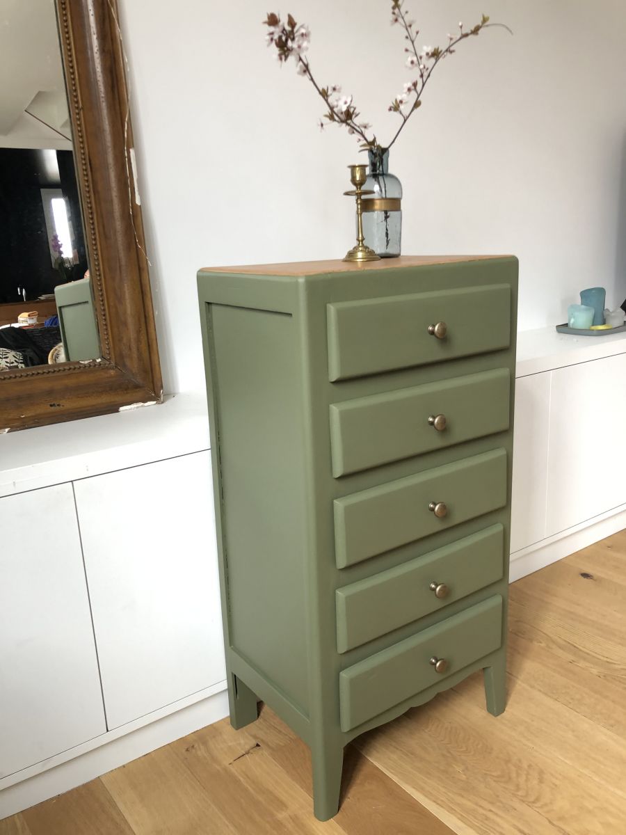 Charmante et élégante commode, chiffonnier des années 50 avec de jolis pieds en biais.