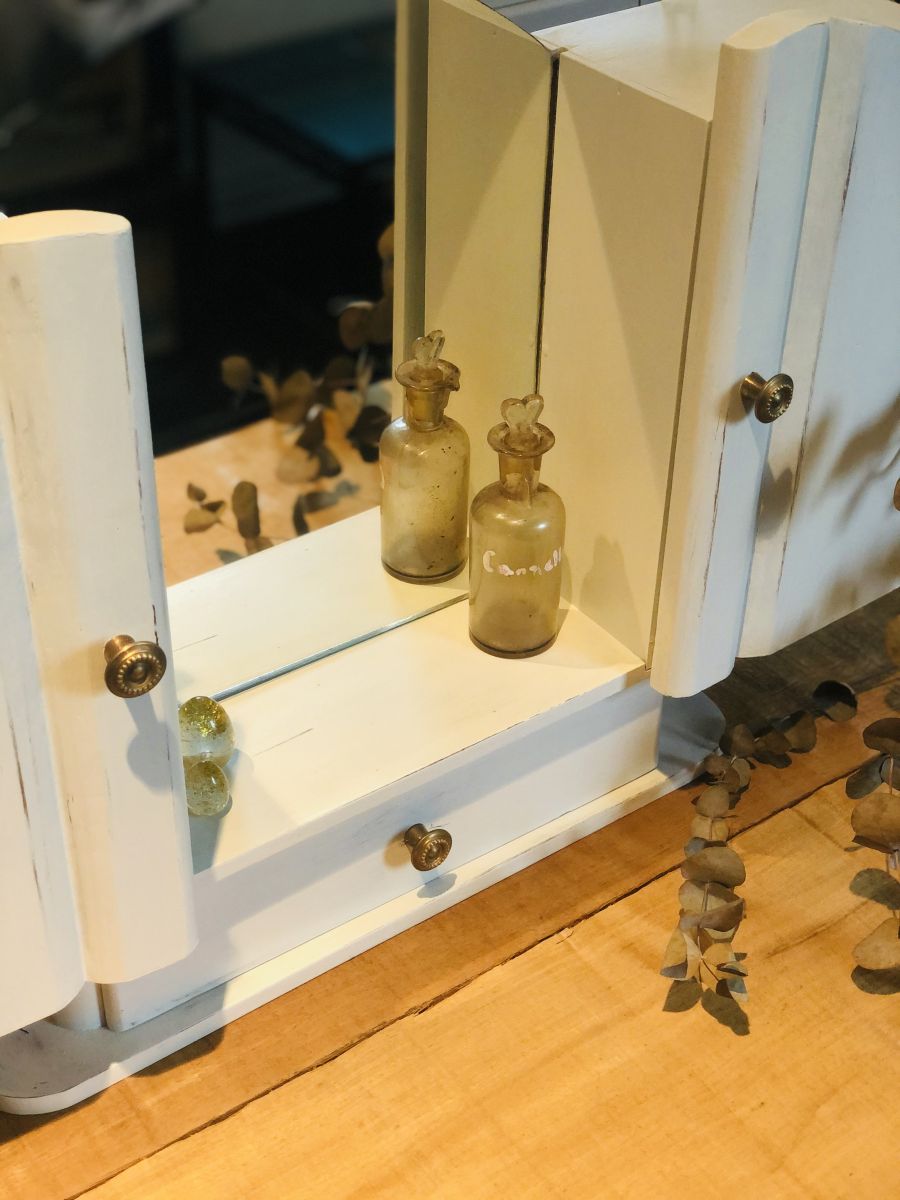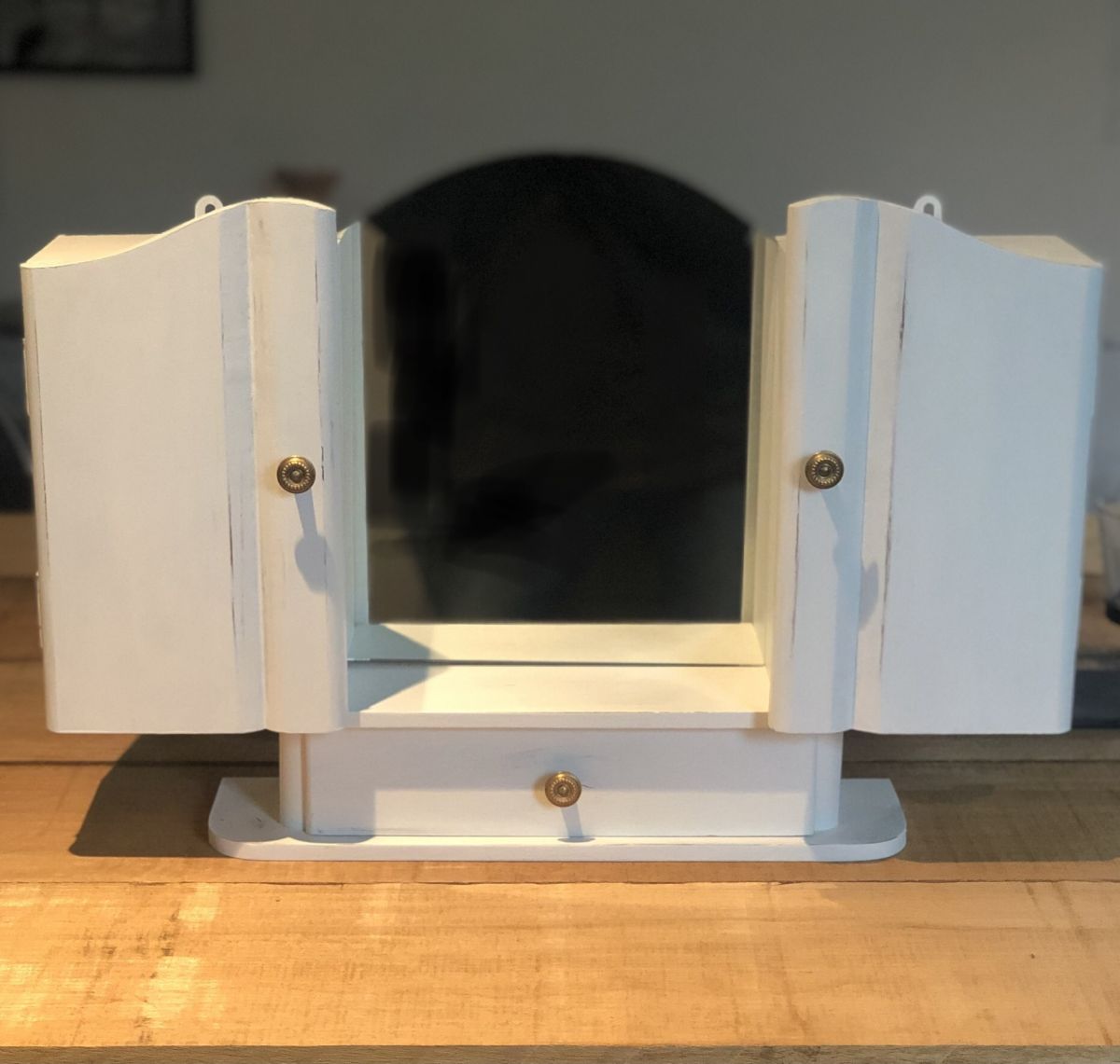 Elle sera parfaite dans une salle de bain , un cabinet de toilette ou en décoration murale. Elle possède deux armoires de chaque côté et un tiroir central .