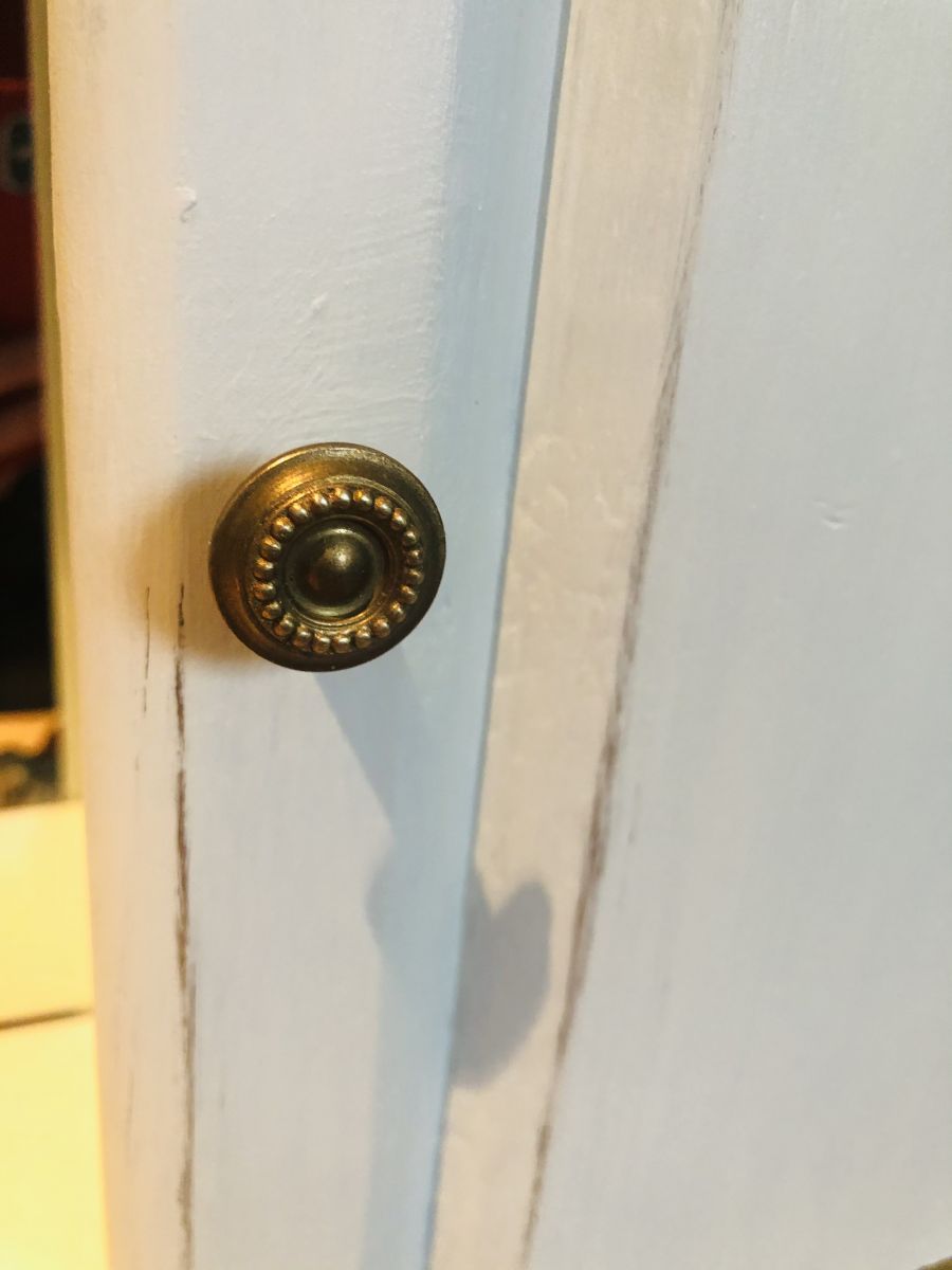 Petite étagère murale vintage, joliment patinée, blanche avec ses boutons en laiton doré et son papier intérieur petites fleurs vertes d’époque.