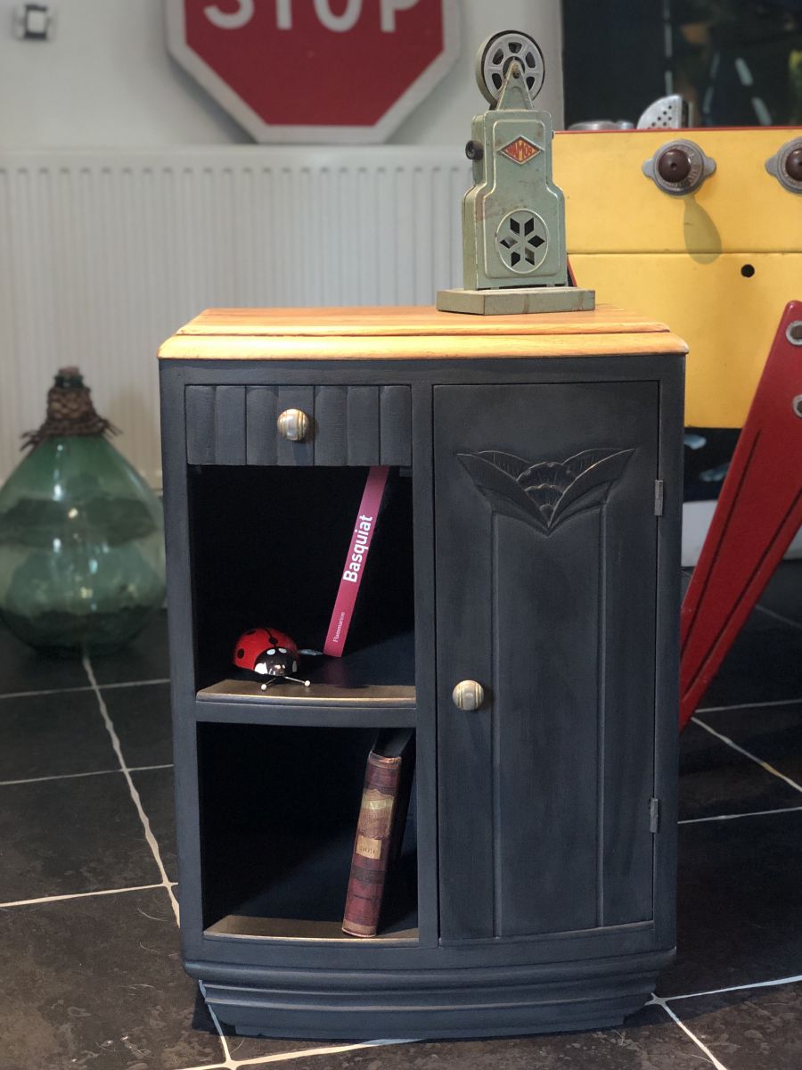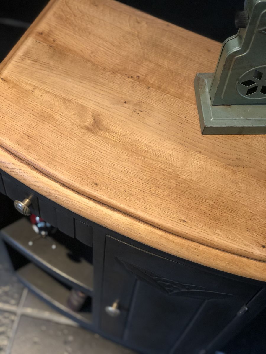 Jolie petite commode Art Déco , noir mat , patinée, en chêne avec plateau naturel , patiné également.