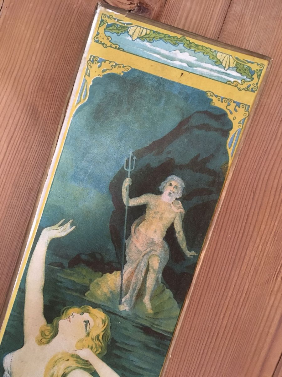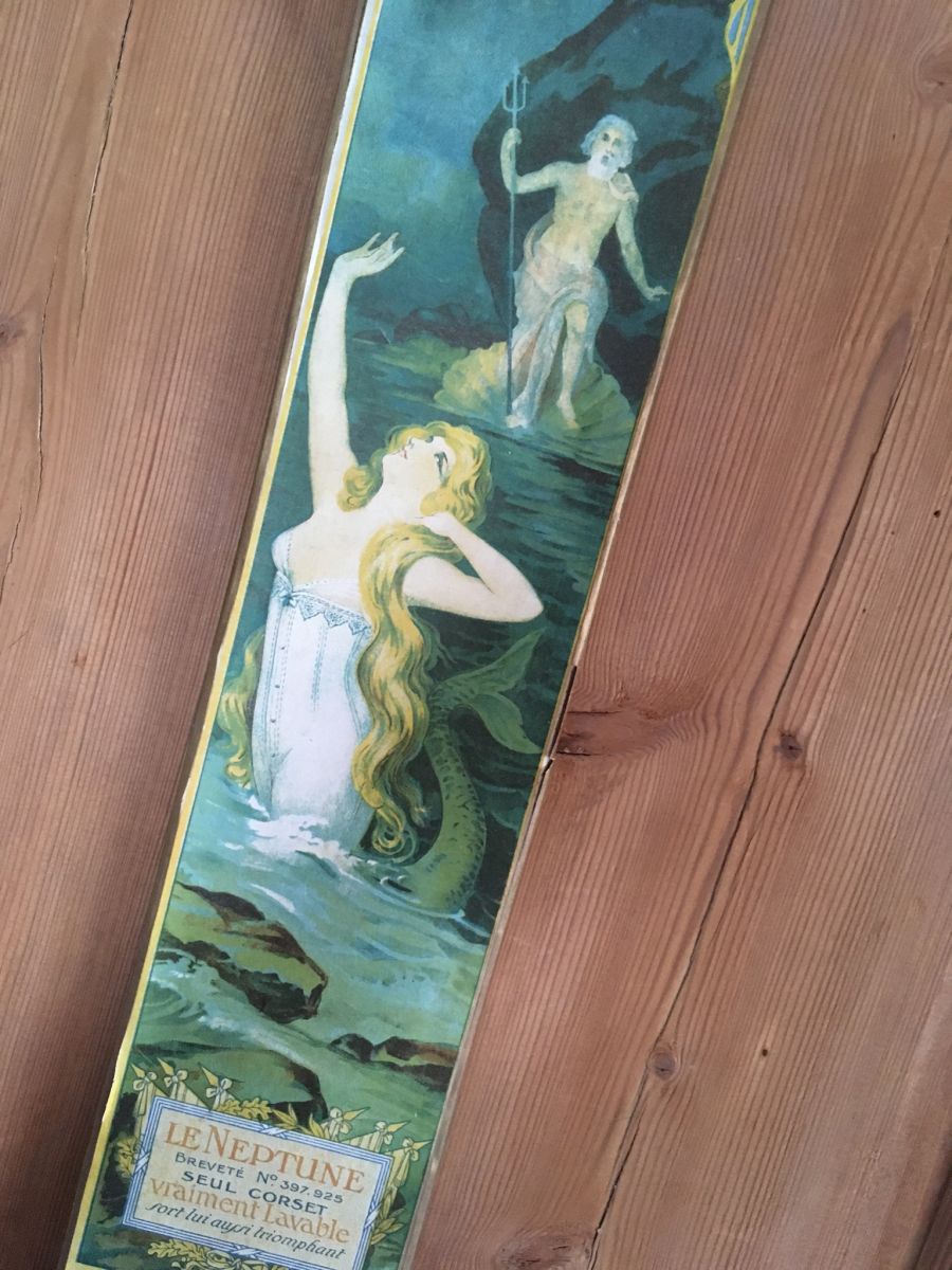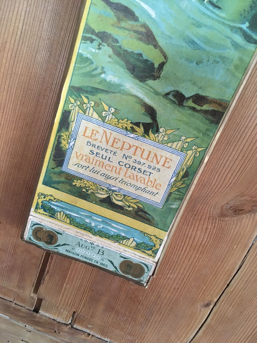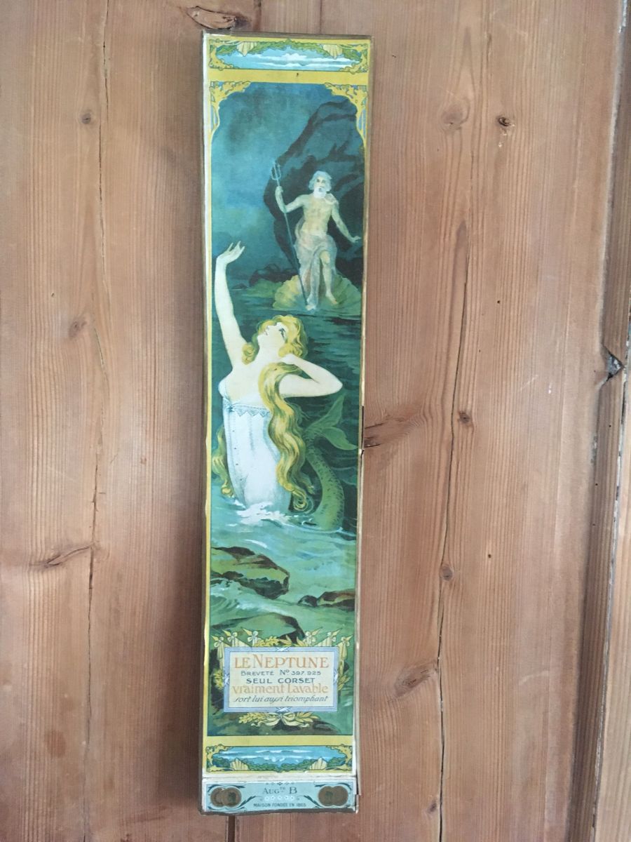 Publicité ancienne papier, collée sur bois « le Neptune seul corset vraiment lavable. »Maison fondée en 1865.