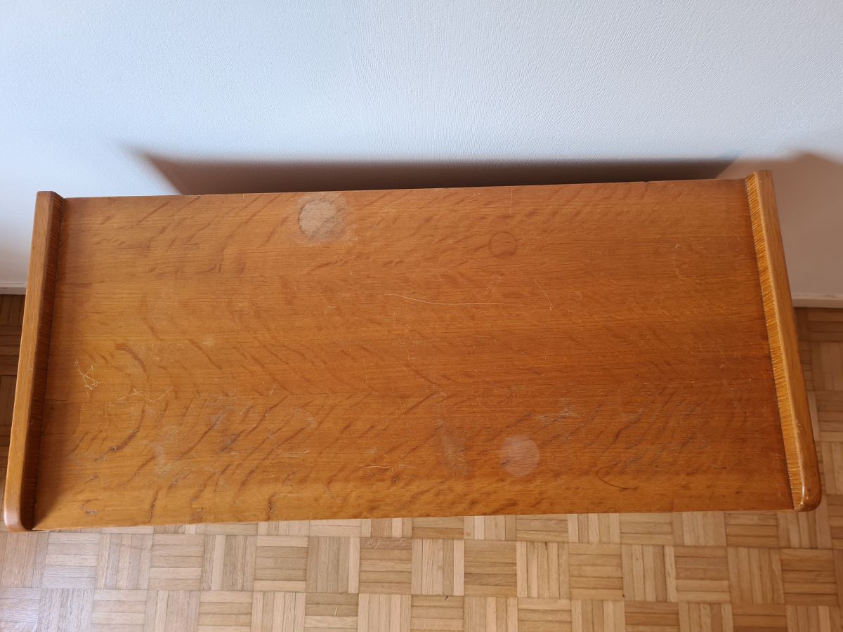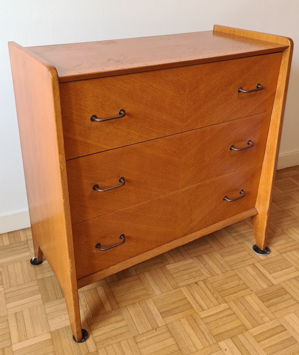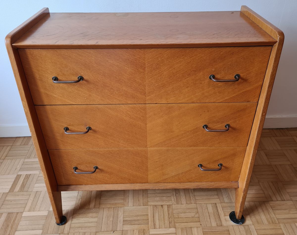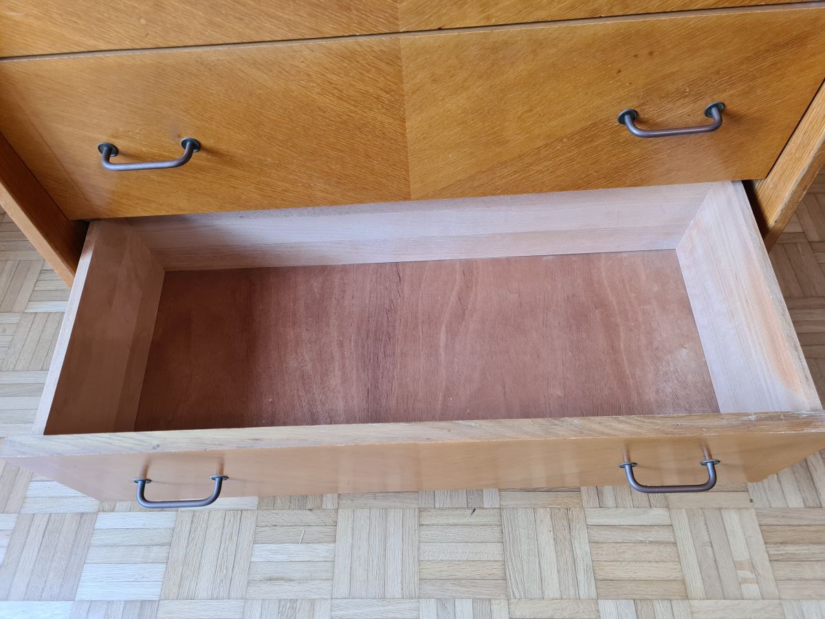 Commode pieds compas de 1957 (vendue avec la facture) en chêne clair.